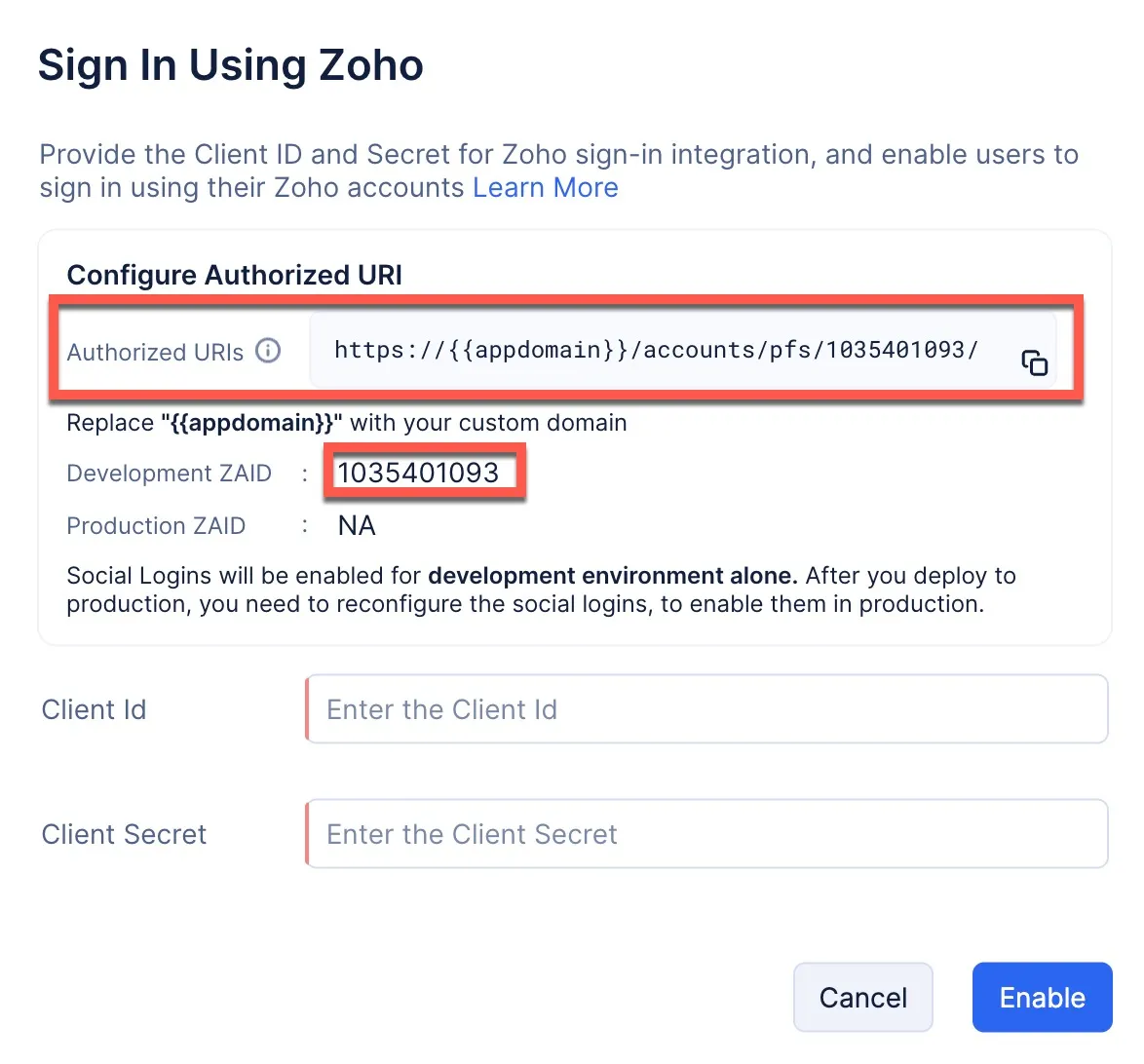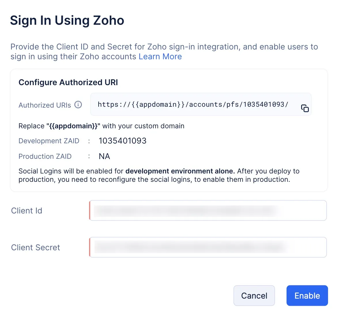 Enable Zoho Social Login