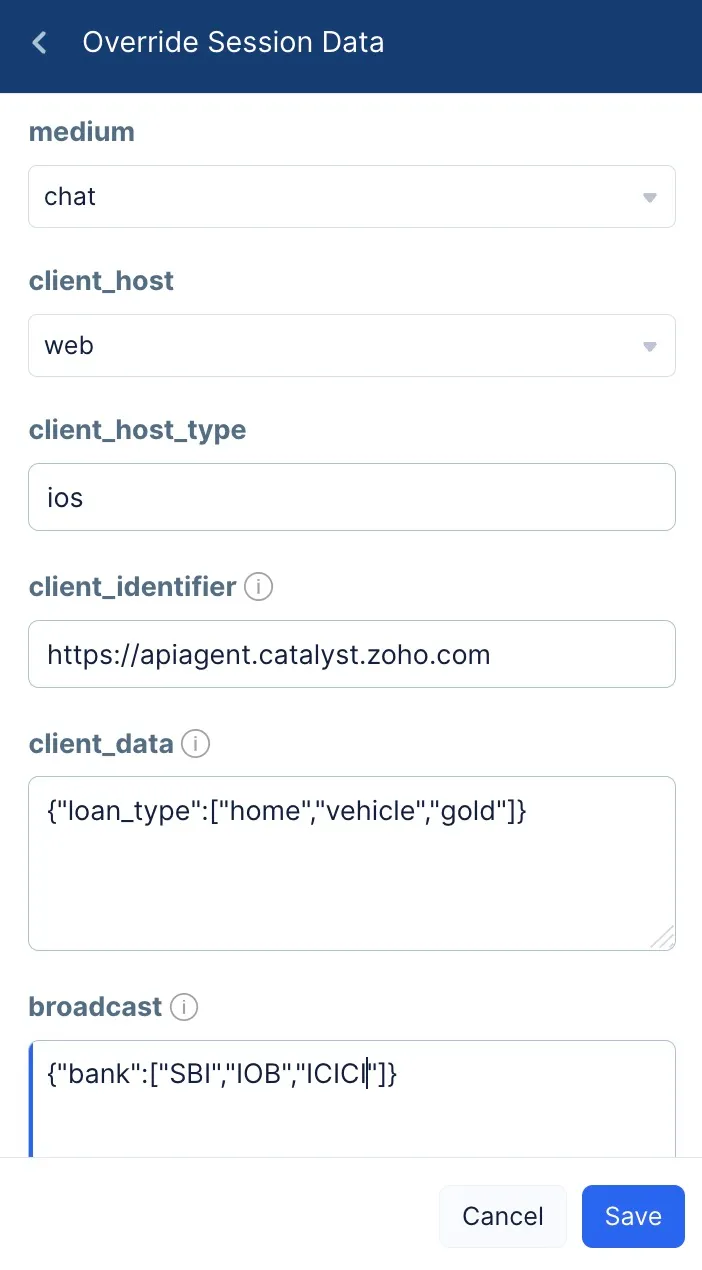 If your functions use the sessionData argument in its business logic, then you can test your action with different sets of mock session data using the Override Session Data option available in the top-right corner of the chat window. For example, if you have written any code logic specific to the web client, you can set the apt session data values and mock how the logic would work, if the bot is being accessed from an actual web client in production.
