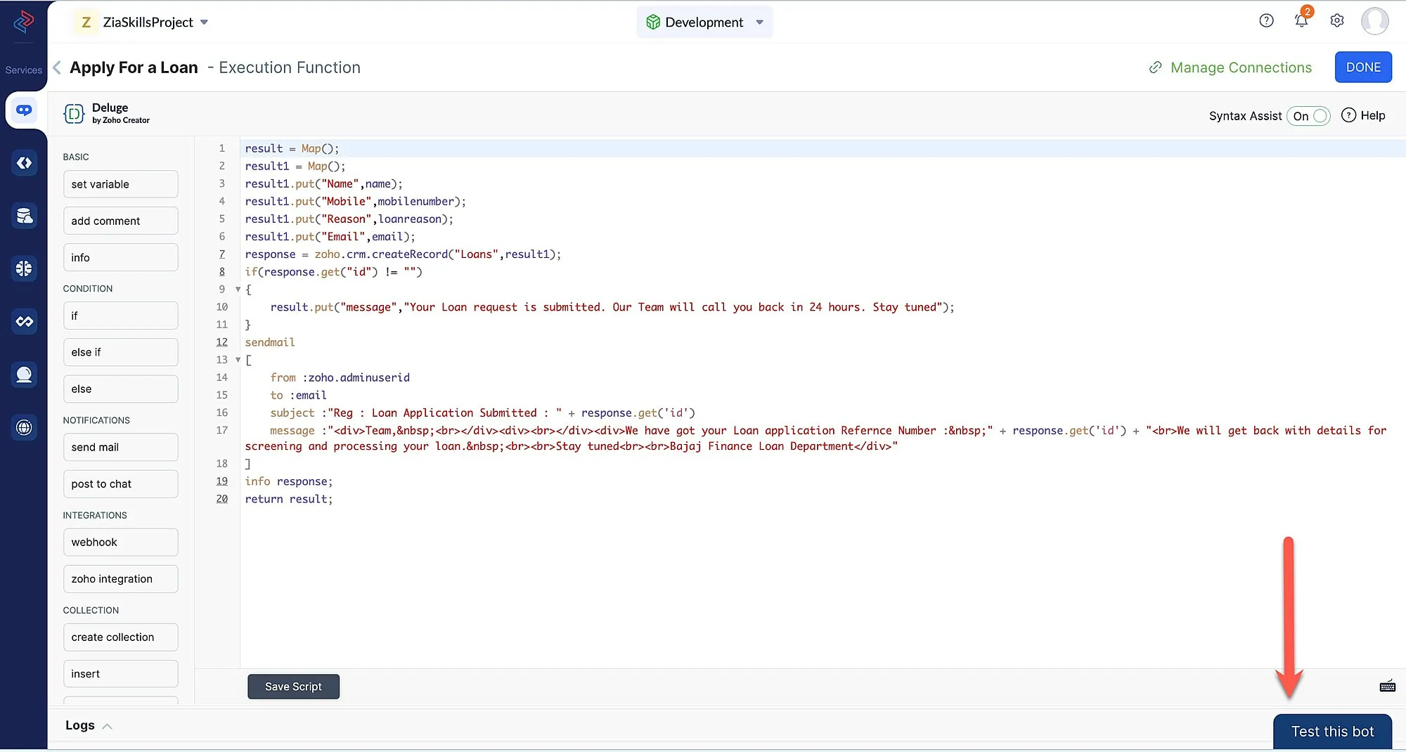 To test your action before deploying it, you can click on Test this bot to use the sample chat window on the right side panel of the Edit Execution Functions page. This sample chat window would look similar to the actual chat window of your bot in the production.