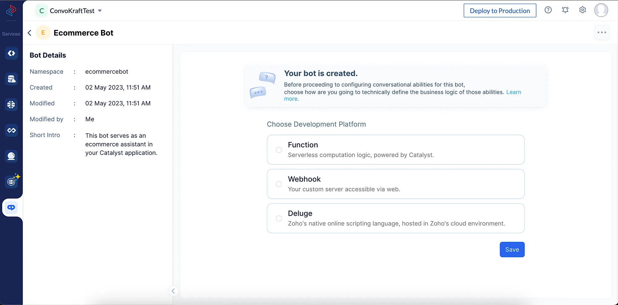 The first step in working with the ConvoKraft service is creating a bot. You can create a bot and add appropriate actions to it from the Catalyst console. Please follow the below steps to create a new ConvoKraft bot.