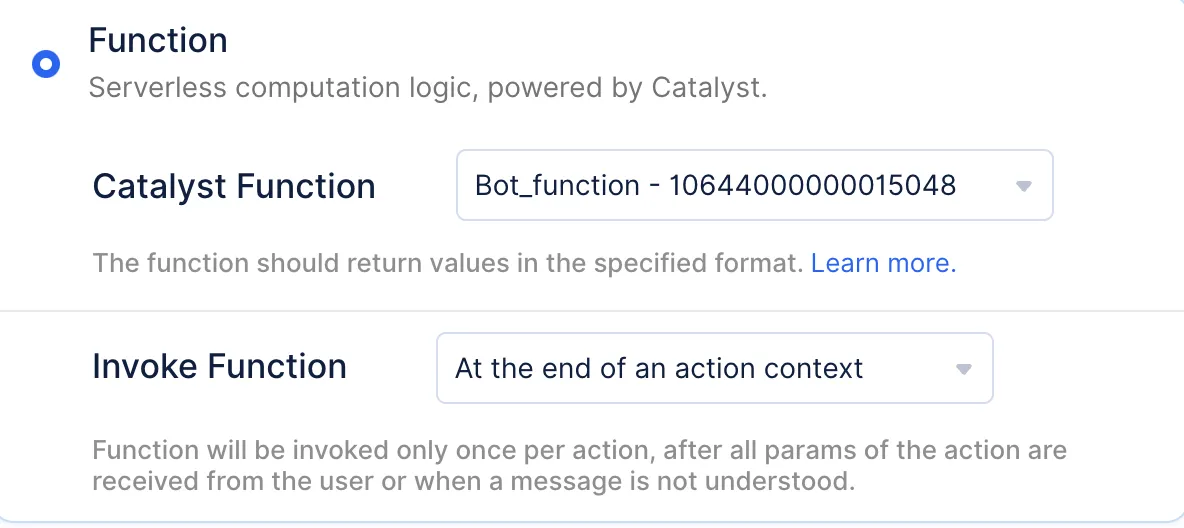 If you choose to code your business logic using Catalyst Integration functions, then select Function and associate the required Catalyst Function with the ConvoKraft bot from the drop-down list. All functions of the type Bot Logic present in your project will be listed here. You can also choose to invoke the function at the end of an action or right after every message exchange in the conversation. You can learn more about using Catalyst Integration functions, from this page.