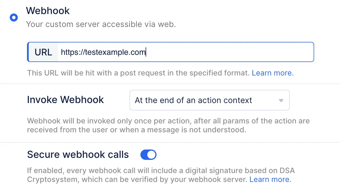 If you choose to code your business logic independently and host it in any external public server that is accessible by ConvoKraft, then select Webhook. Please make sure you plug in the valid URL of the endpoints of your server. Similar to Catalyst Integration functions, you can choose to invoke the webhook at the end of every action or after every message in the bot conversation. You can also choose to secure your webhook calls, if required. To know more about the usage of webhooks in detail, please refer to this page.