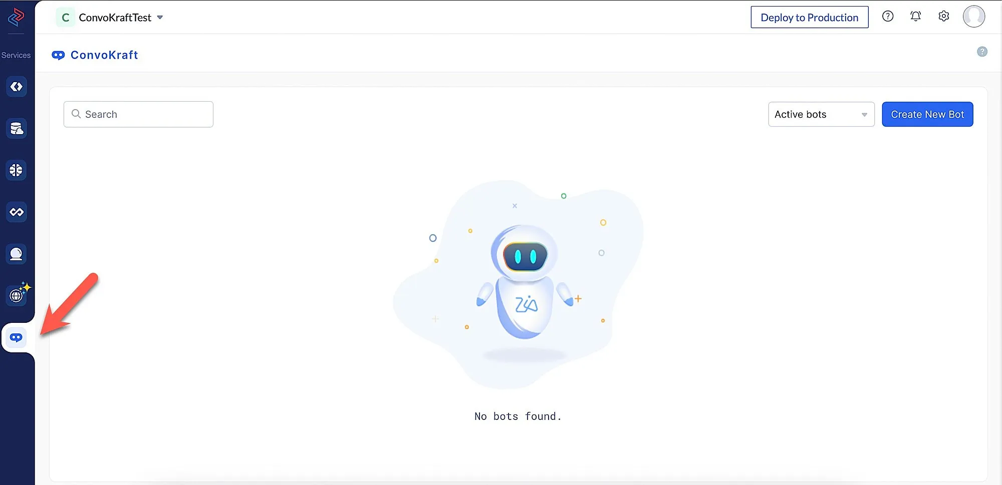 - Click the ConvoKraft icon in the left navigation pane of the Catalyst console in your project and navigate to the service. This will open the Bots page.
