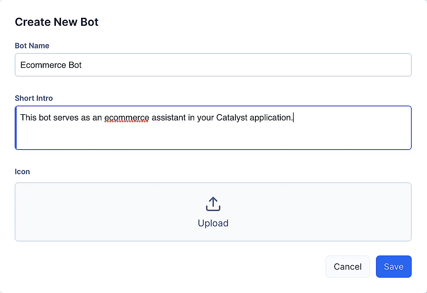 In the pop-up, provide a name for the bot. You can also add a short description and an icon for the bot, optionally.