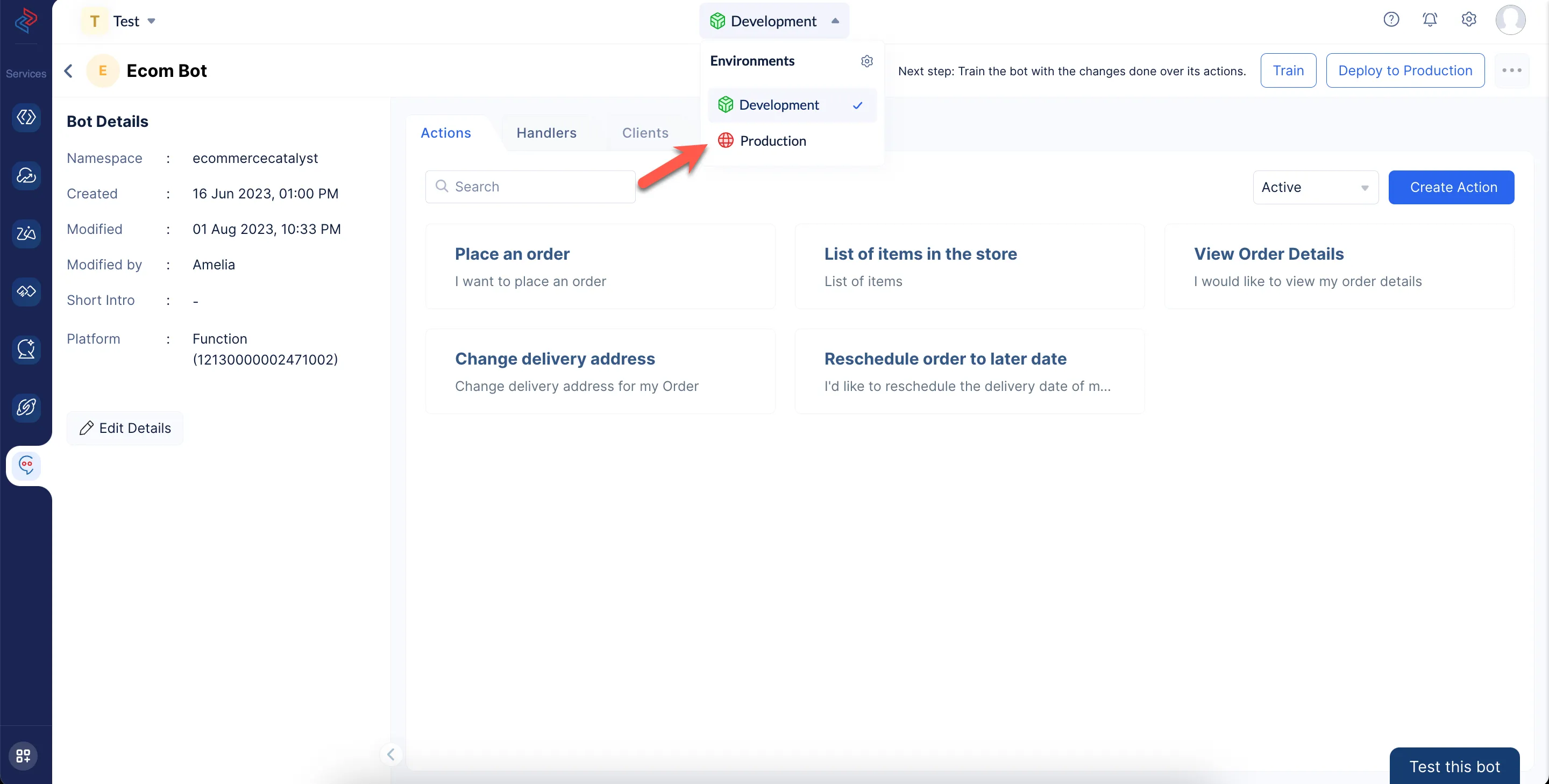 Any changes made to the bot or its underlying actions are only saved in ConvoKraft’s development environment. These changes will not be instantly available on the bot in production environment. For the live bot to understand the addition of any new actions, removal, or modifications made in the existing actions, the bot has to be deployed to production.