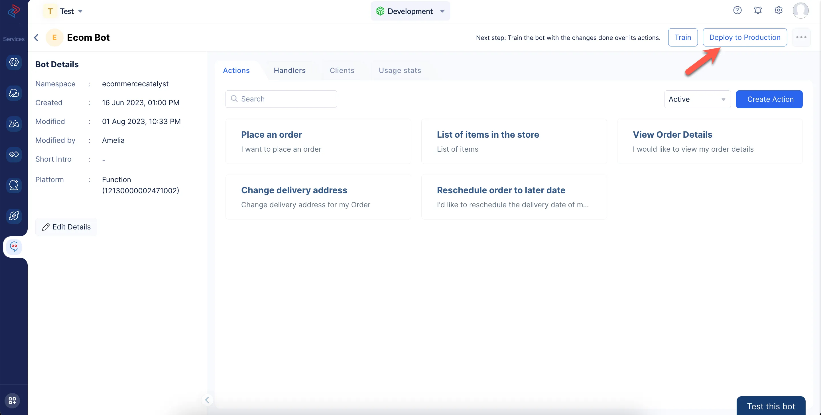 To deploy a bot to production, click the Deploy to Production button on the Bot’s details page.