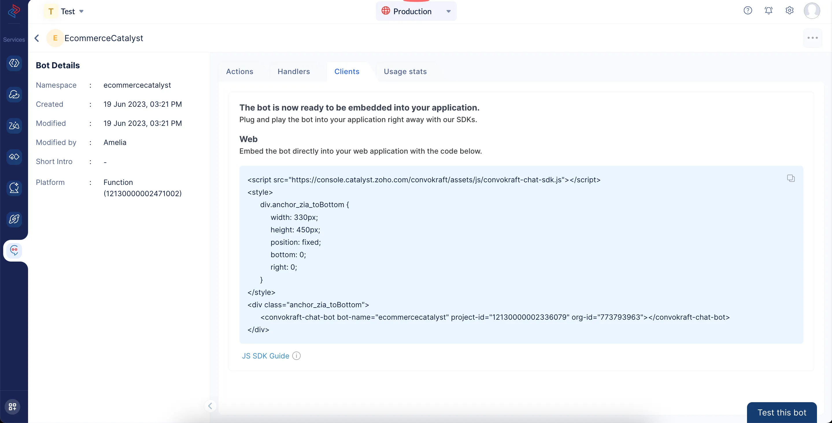 After mentioning all the required values, click the Deploy button. Upon successful deployment, any changes made to underlying actions will be reflected in the production bot.