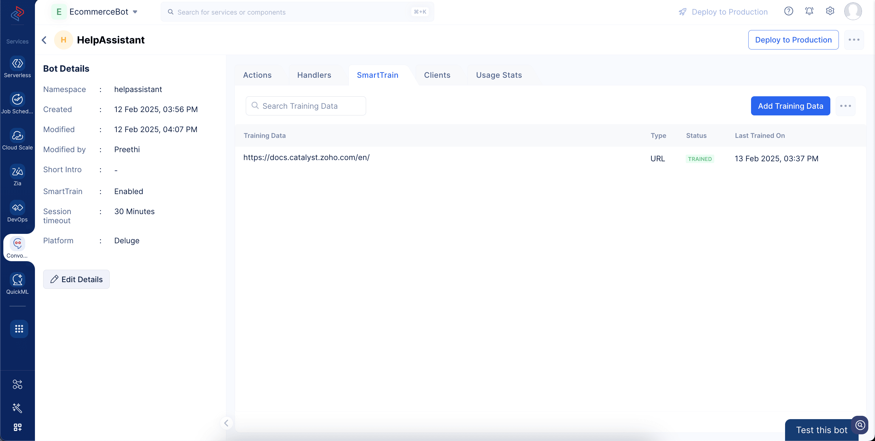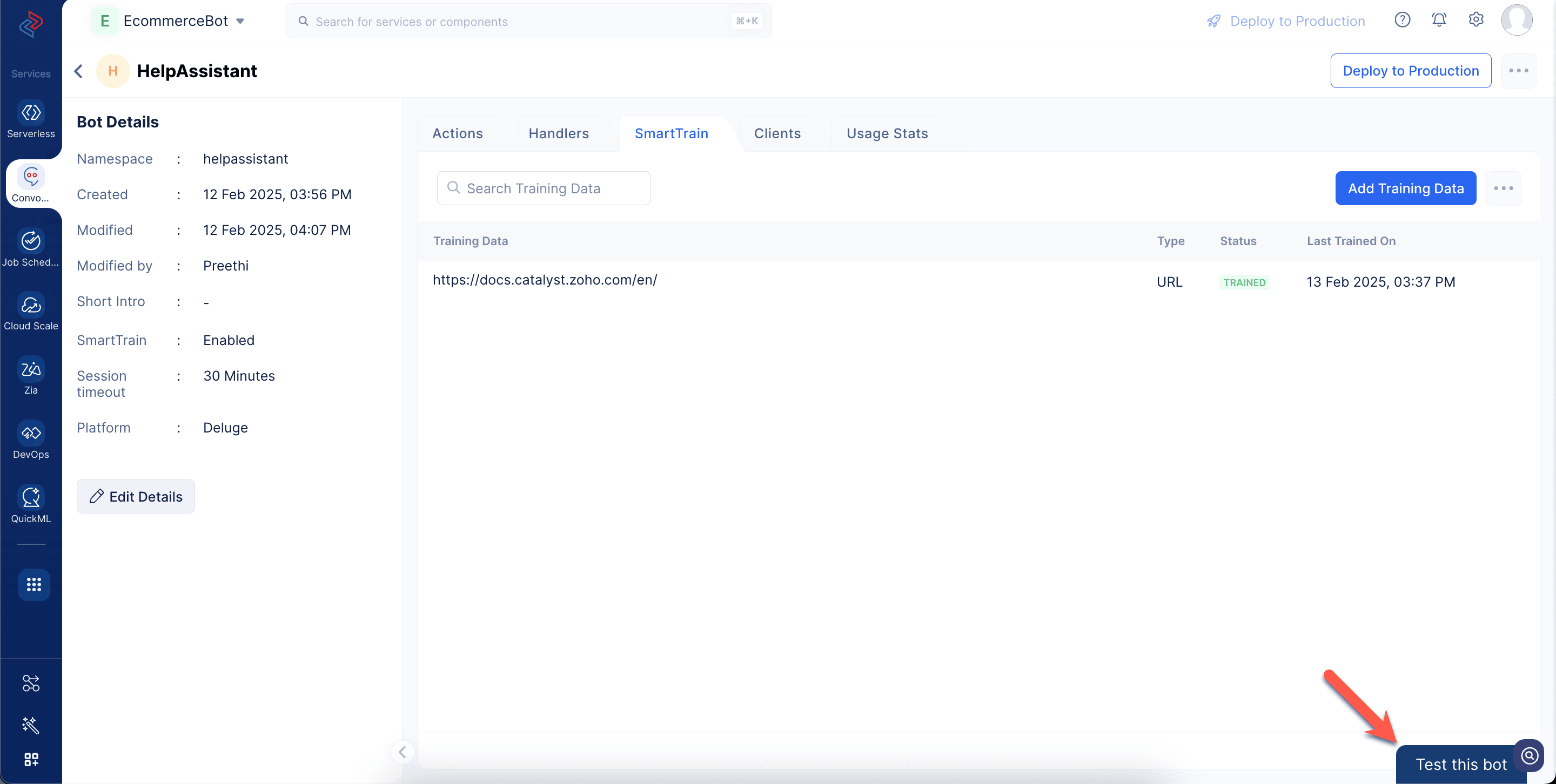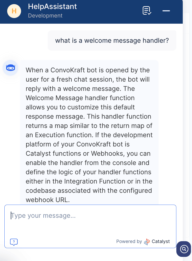 You can now test the bot by asking questions related to the uploaded custom data. Here in our case, the bot will be able to answer any queries related to Catalyst as described in the help documentation. We will see how this works in the next section.