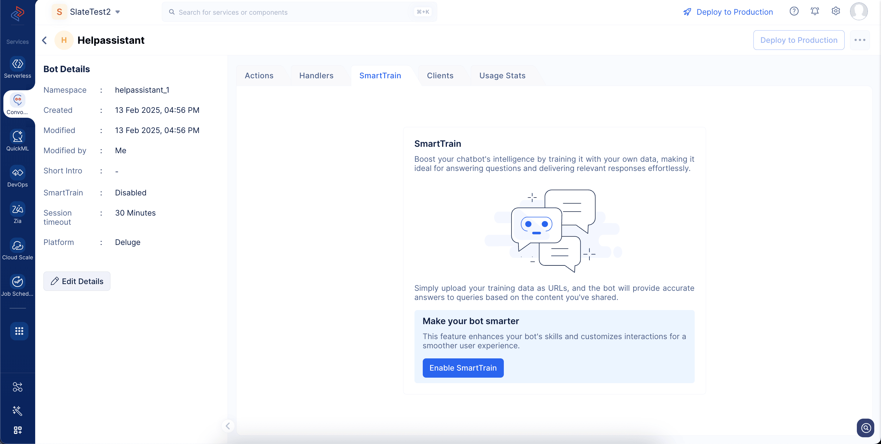 You can disable the SmartTrain feature if you don’t want the bot to respond to questions based on any custom training data. Disabling SmartTrain temporarily pauses its functionality, but once re-enabled, the bot will resume responding to queries using the existing training data. If you want to remove the training data permanently, be sure to delete it as explained in the previous section.