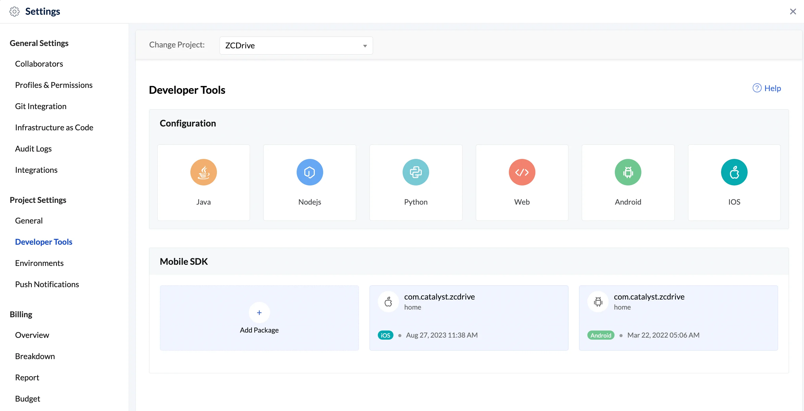 - Navigate to Settings, then Developer Tools in your Catalyst console of your project. You will find your existing Android or iOS package under the Mobile SDK section. Open the required package.