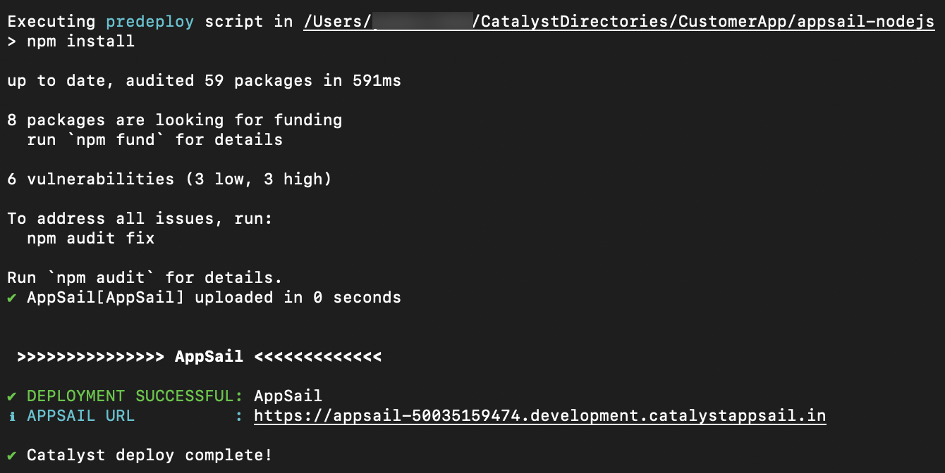 If the AppSail app is already initialized in the project directory, the CLI will automatically deploy the app with the rest of the project resources when you execute the catalyst deploy command. The CLI will display the endpoint URL of the app after it is deployed, that you can open it with.