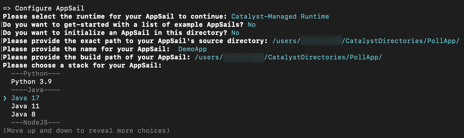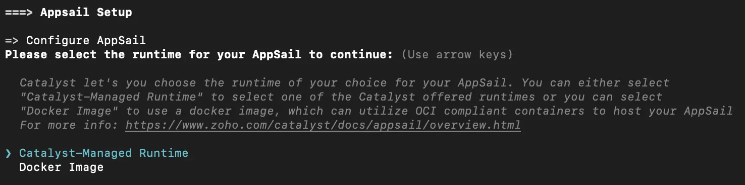 - The CLI will prompt you to select the runtime type as Catalyst-Managed Runtime or Docker Image when AppSail is initialized or added. Select the first option.