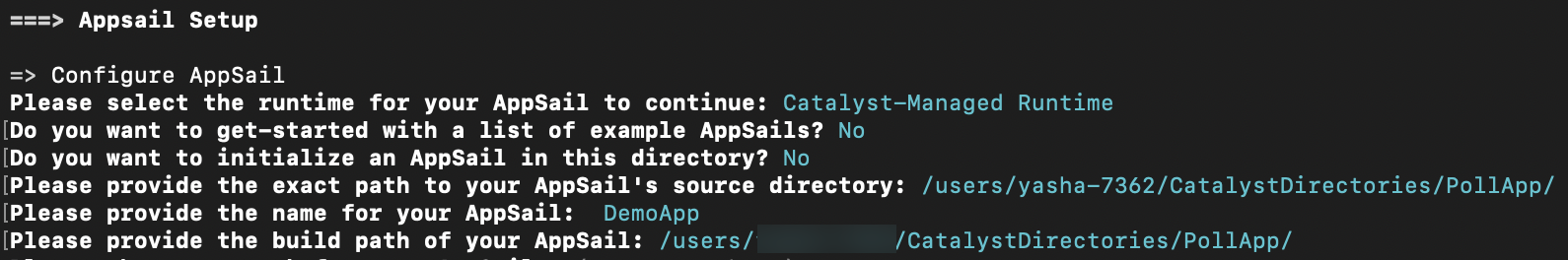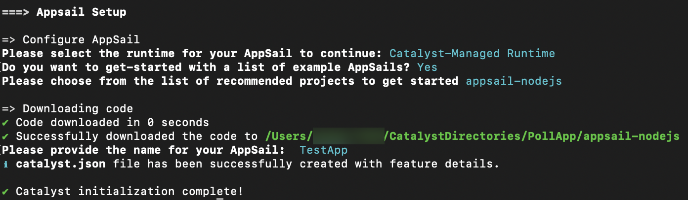 AppSail is now initialized or added in the source directory you selected, and the app is now associated with the Catalyst project. The configurations will be updated in catalyst.json file accordingly.