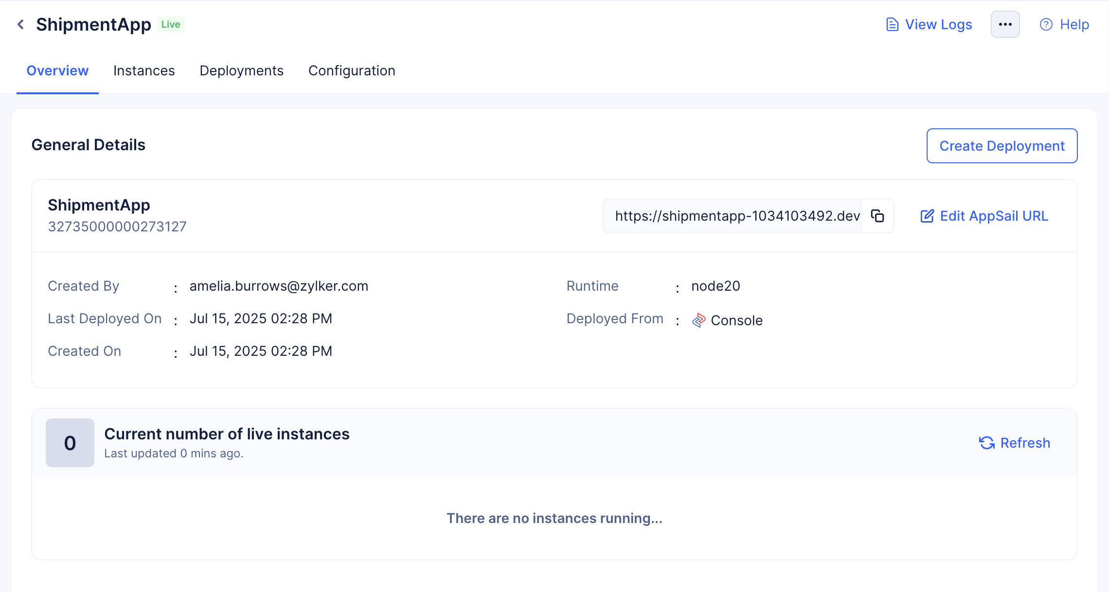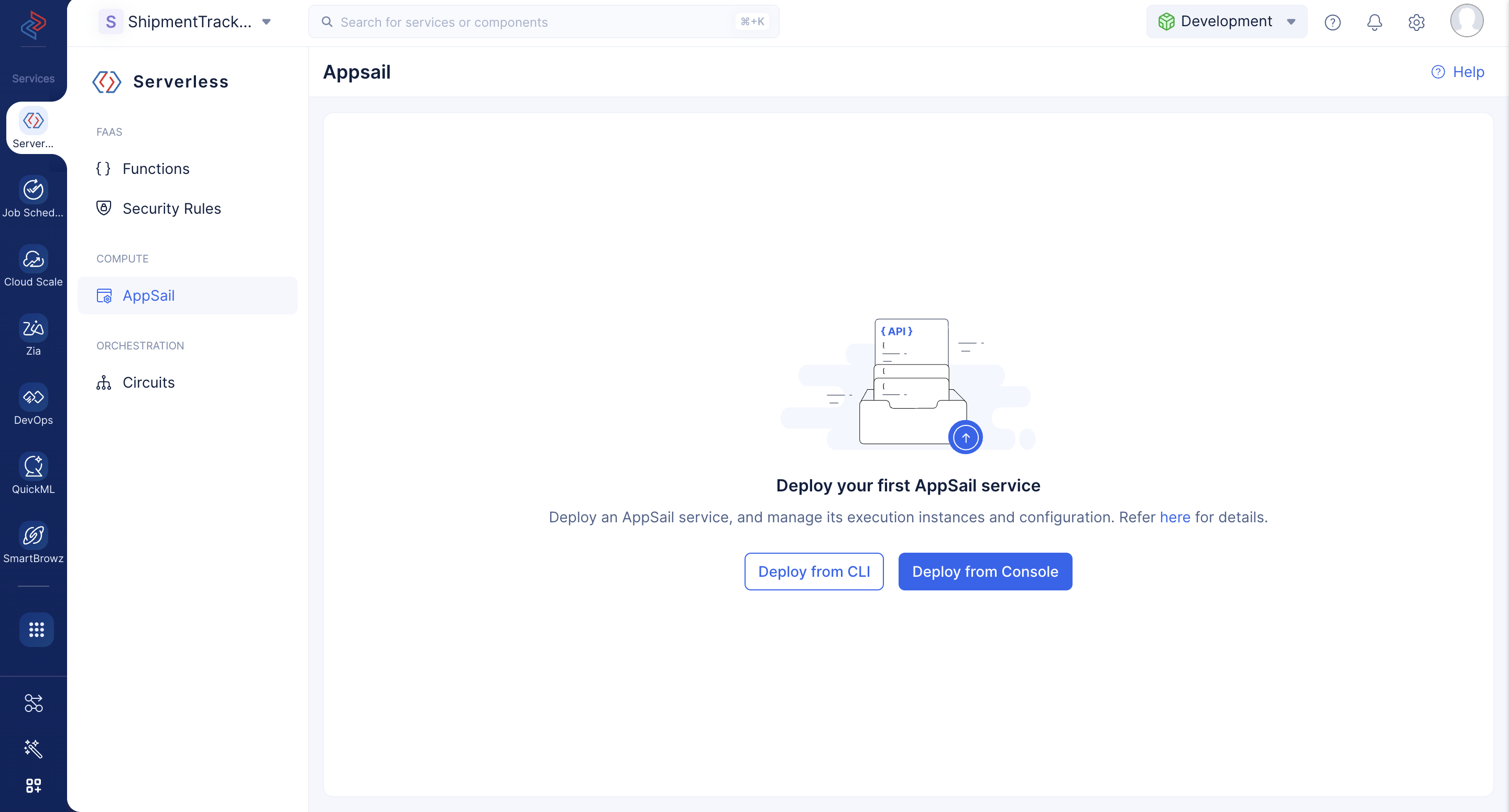 - Navigate to the Serverless service in your Catalyst project that you wish to deploy your app in, then click AppSail under Compute.