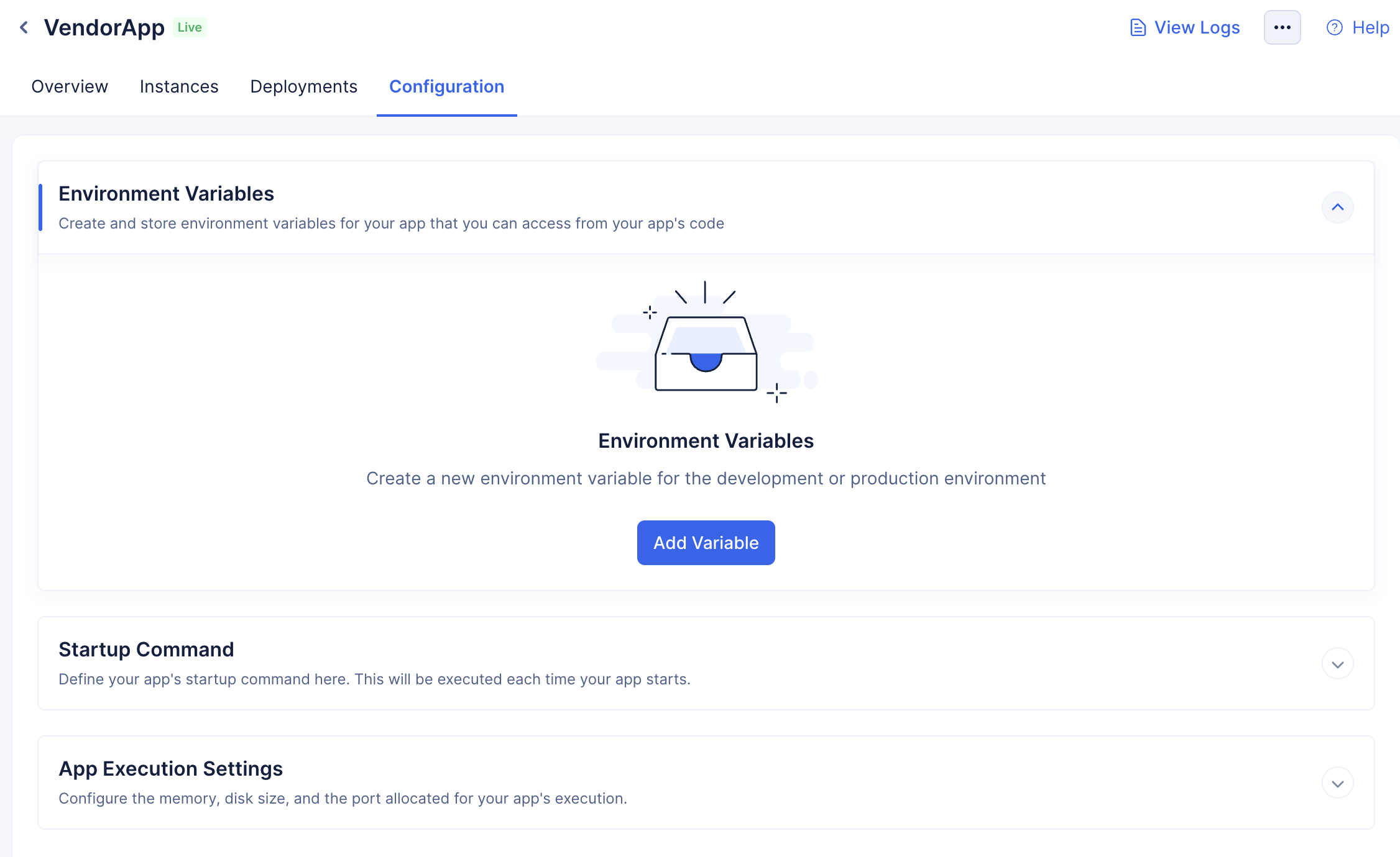 The Configuration section enables you to perform configurations for your AppSail services from the console. These configurations can be done through the app-config.json file of your app for the Catalyst-managed runtime apps and then be deployed, or directly during deploying the app from the console for Catalyst-managed or custom runtimes. You could also configure the startup command in a container image depending on its setup for the apps deployed as a container image.