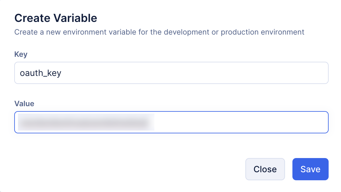 - Enter the keyname and value of the variable. If you’re working from the development environment, the value you enter will be the development value, and vice-versa.