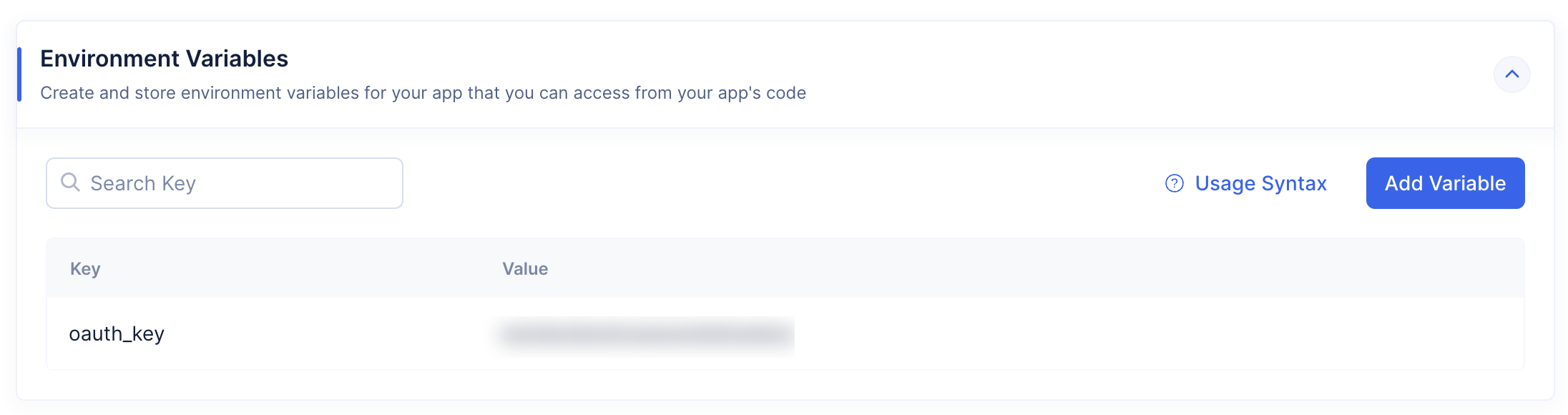 The variable will be saved and listed in the section. You can search for variables by their keyname from the search bar, or add more variables.
