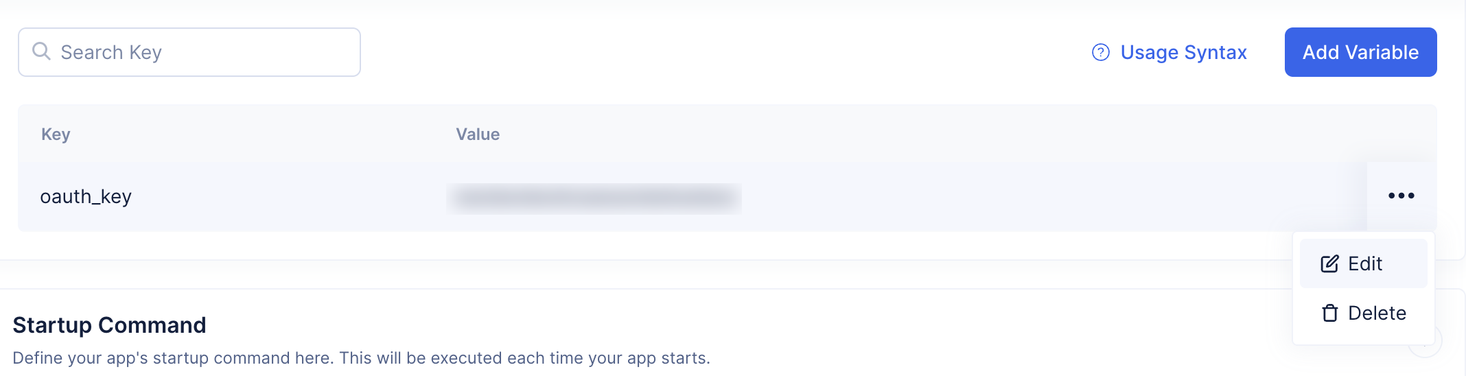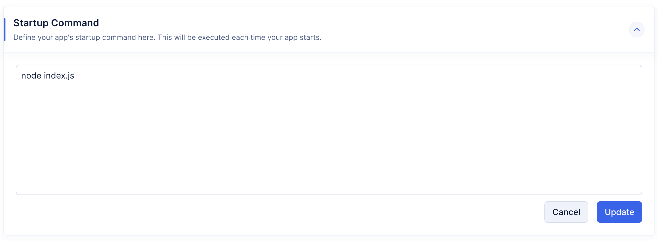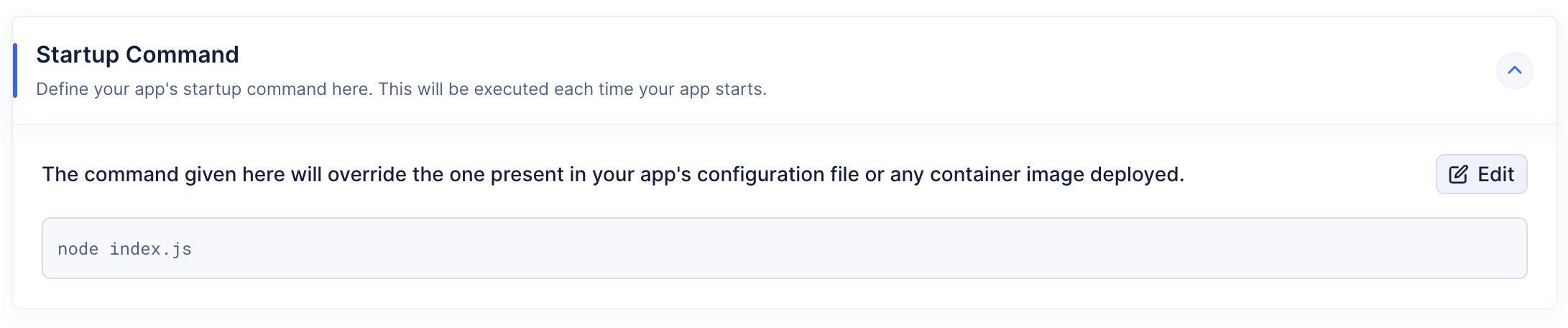 You can configure the startup command for your app, or edit the command already present, from this section. Refer to the Startup Command section for details about this.