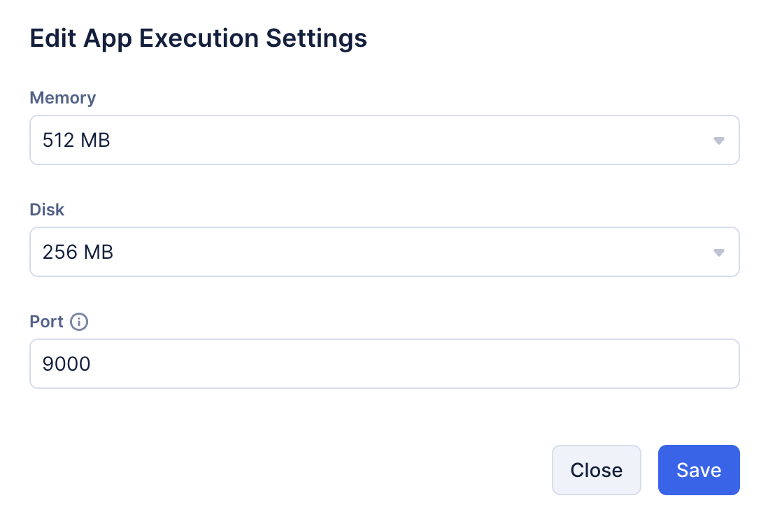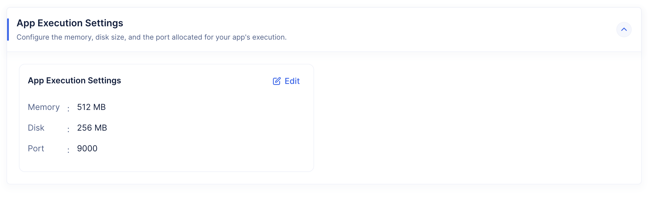 You can allocate the memory and disk size for your AppSail’s execution based on its performance requirements in this section. You can also configure the port for your app’s execution here. Refer to the links for details.