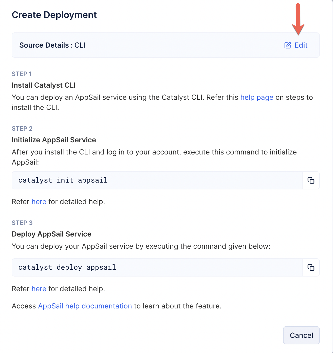 As mentioned earlier, you have the flexibility to change the source and the type of app (Catalyst-managed runtime or custom runtime) from its previous deployments by clicking Edit for the source.