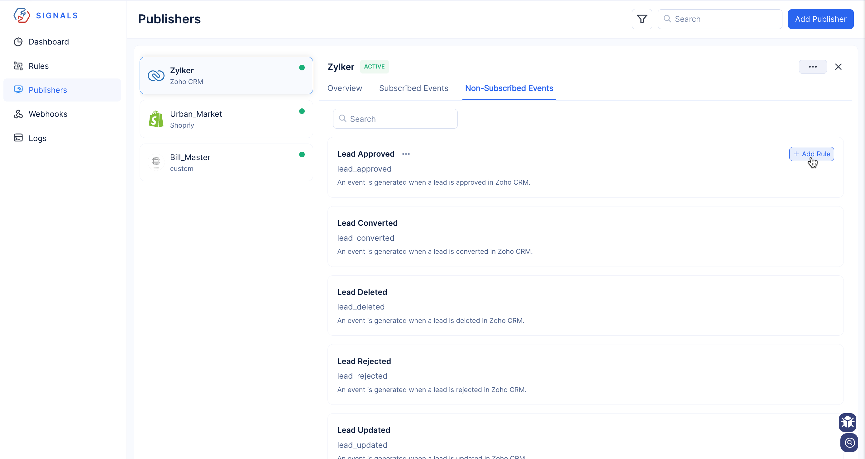 Subscribed Events of a Zoho Publisher are those with which you have created a rule. Whereas, Non-Subscribed Events are the default events that have not yet been associated with any rule.