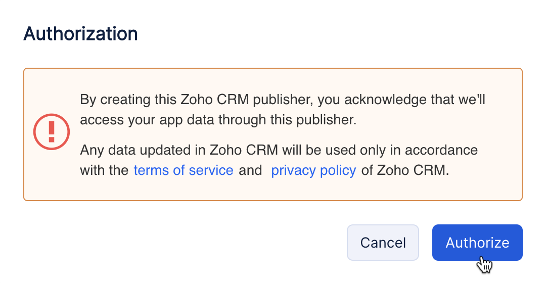 An authorization message pops-up, and requests to access the data of the Zoho service you have created. Click Authorize to continue.