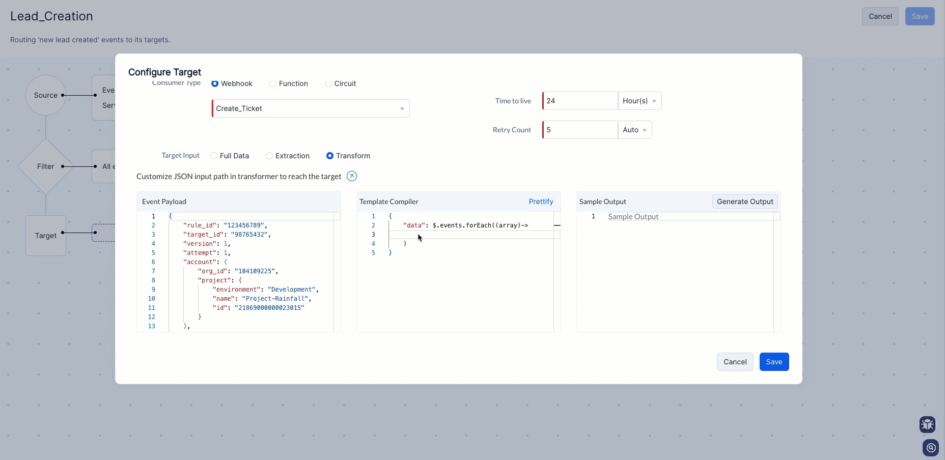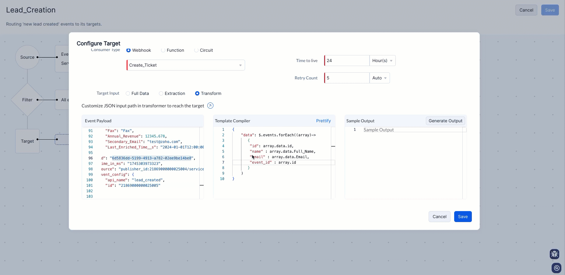 You can also copy and paste the below template compiler for the Lead Created event in Zoho CRM service to witness the instant transformation of your payloads.