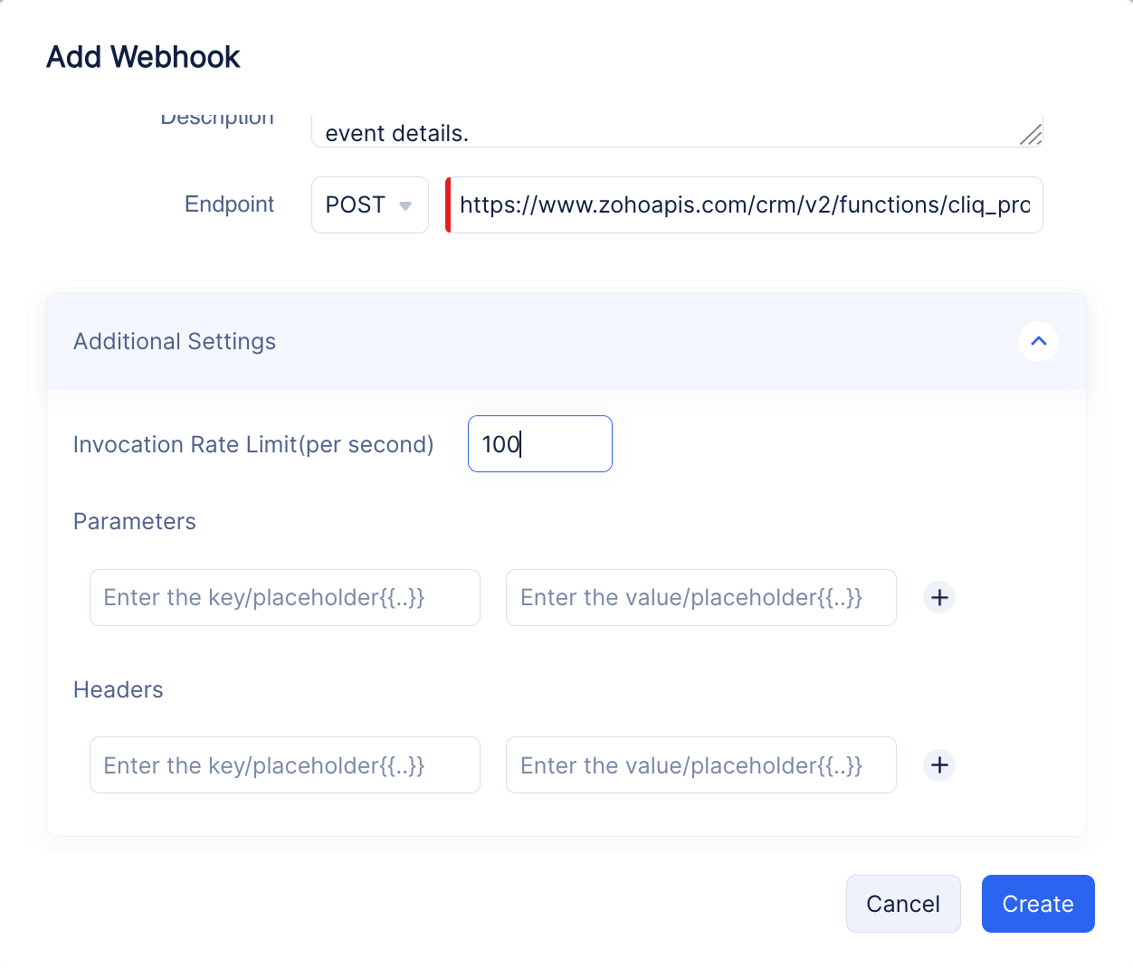 - In the webhook Additional Settings, you can set the dispatch rate limit per second for the webhook call. This will limit the excessive use of endpoints that may overload the target systems.