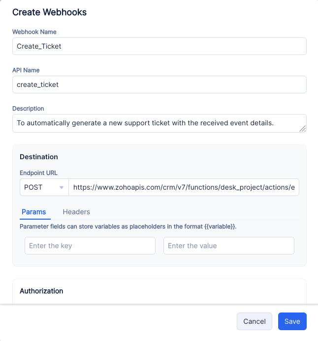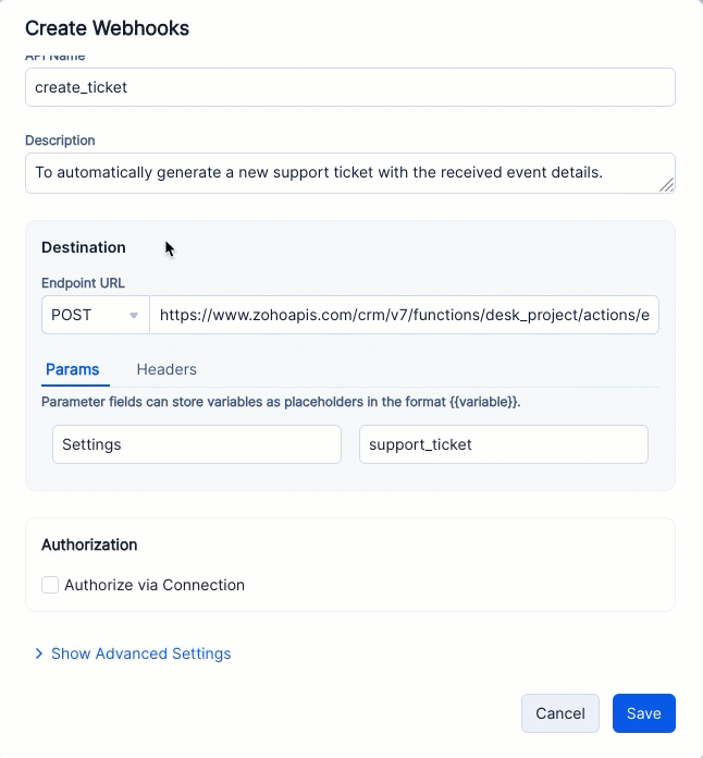 - Placeholder-based static values: Use the format {{static_value}} to represent static values that are assigned during rule configuration. This enables you to use the same webhook across multiple targets, while assigning a different static value to each target’s header or parameter.