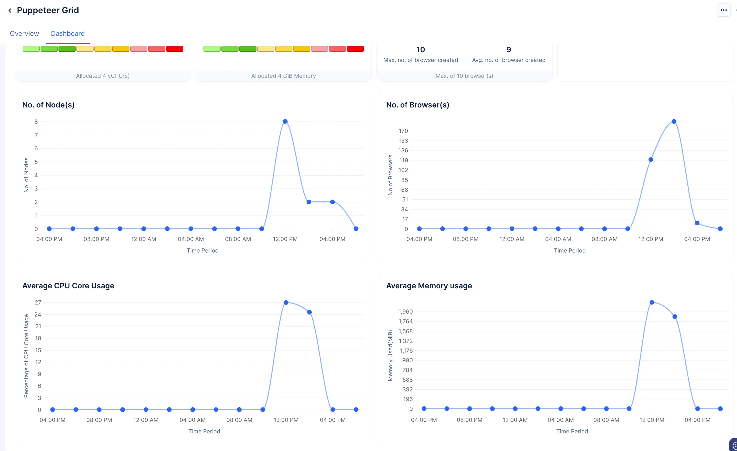 In the Browser Grid Dashboard, you will be able to view four graphs that illustrate various performance statistics of the grid.