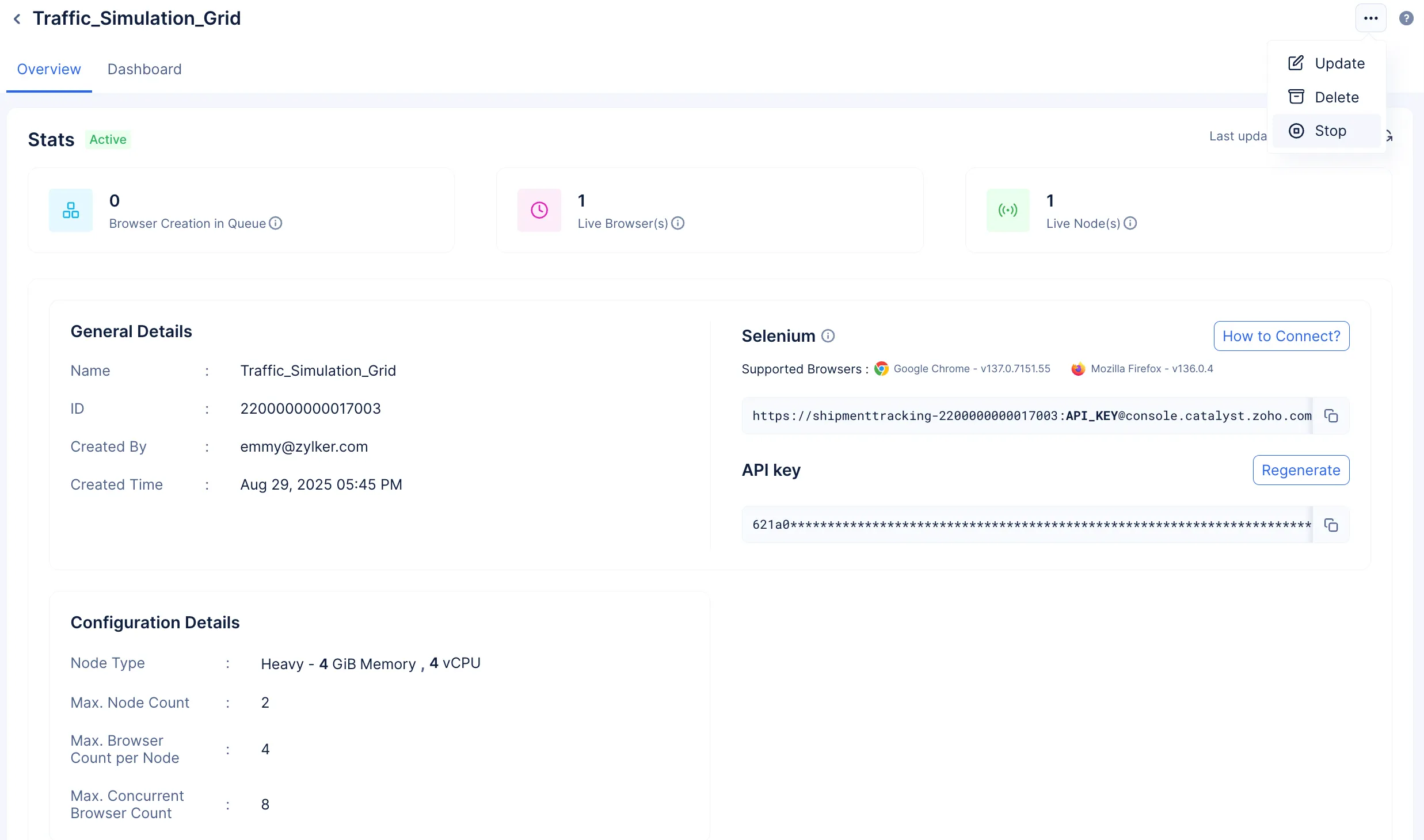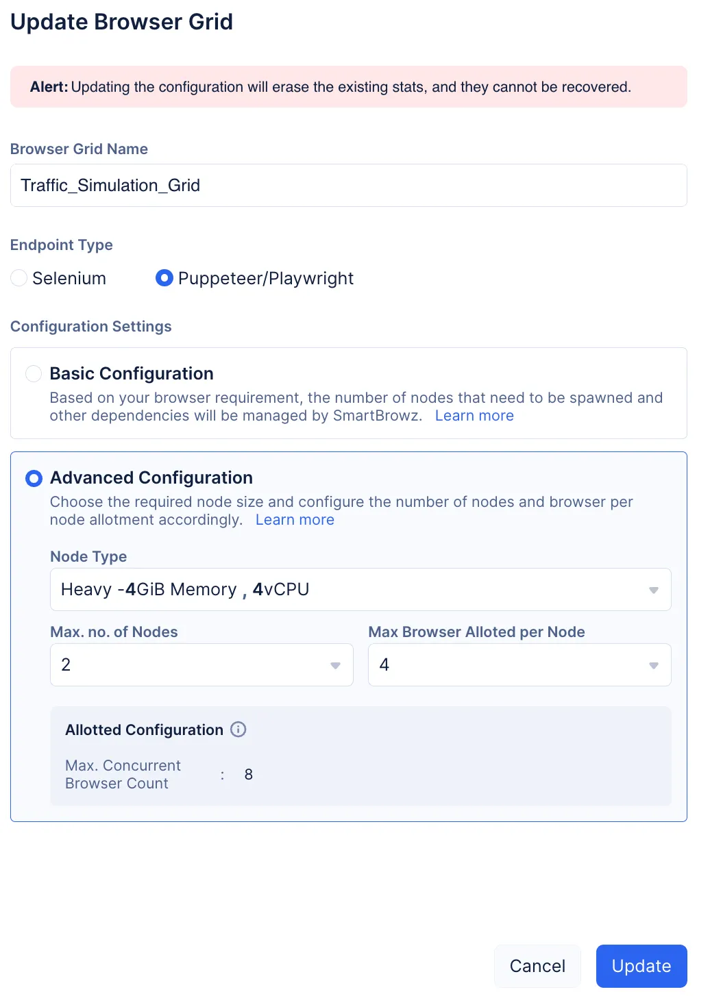 Once you update a configuration, the grid will behave as a completely new grid. The Dashboard populated with data from previous executions will be permanently deleted.