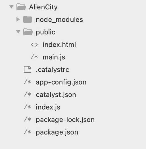 Create a folder in your project’s root directory and name it “public.” This folder will contain the files for your front-end logic. Create the following files inside your public folder (Alien City/public/):