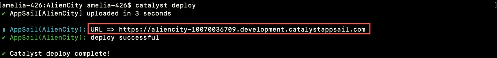 The URL of the AppSail service generated by Catalyst is displayed. catalyst_alcity_catalyst_deploy