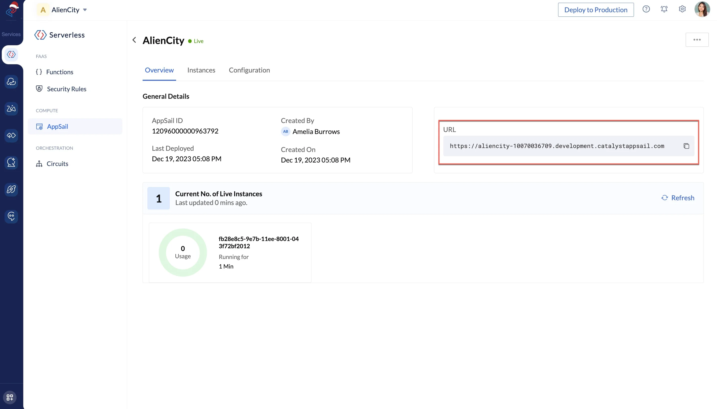 Now, if you navigate to the AppSail component located under the Serverless section, you will see your service has been deployed. catalyst_alcity_catalyst_console_deploy