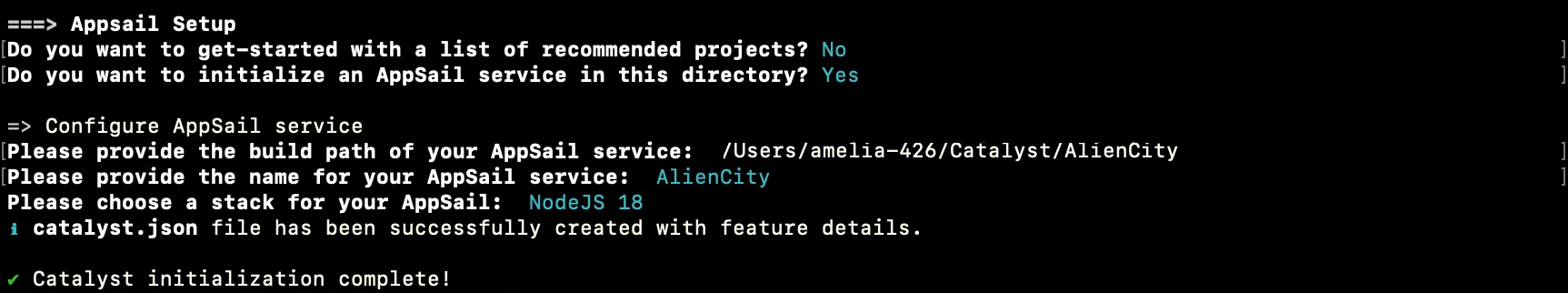 - Because you have initialized the project in the Alien City/ directory created specifically for this application, enter “Y” and click Enter for the prompt asking you to confirm if this the directory you wish to initialize your AppSail service.