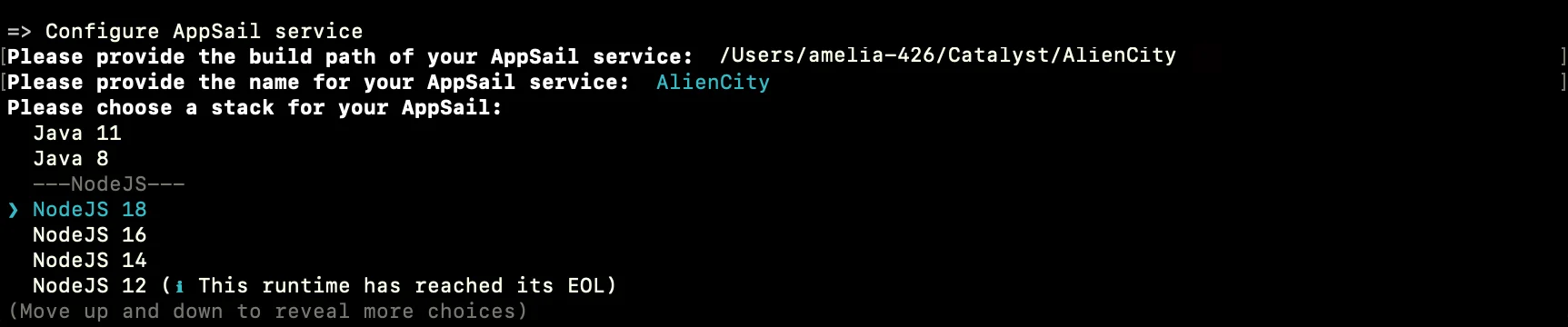 Select your current directory as the build path of your AppSail service, and choose the latest runtime of NodeJS as the programming stack, and click Enter.