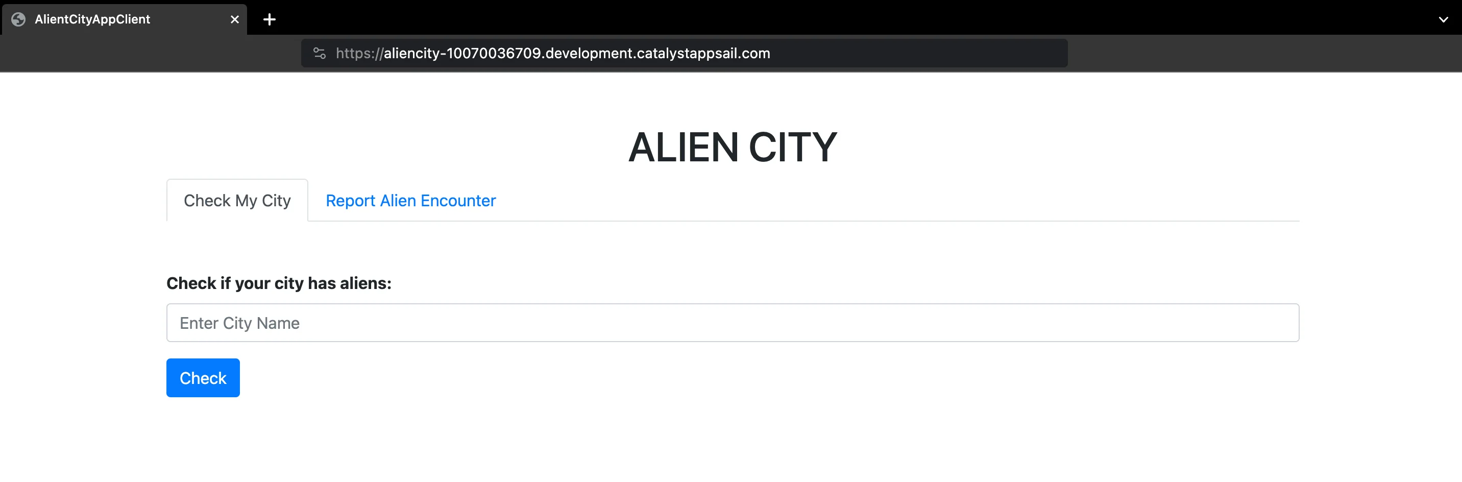 You can now access the application using the AppSail URL generated by Catalyst. catalyst_alcity_catalyst_complete