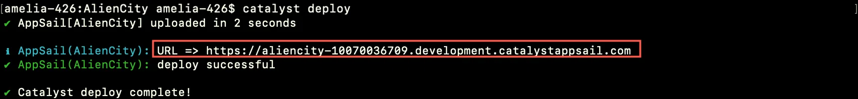 The URL of the AppSail service generated by Catalyst is displayed. catalyst_alien_city_cli_appsail_py_deploy