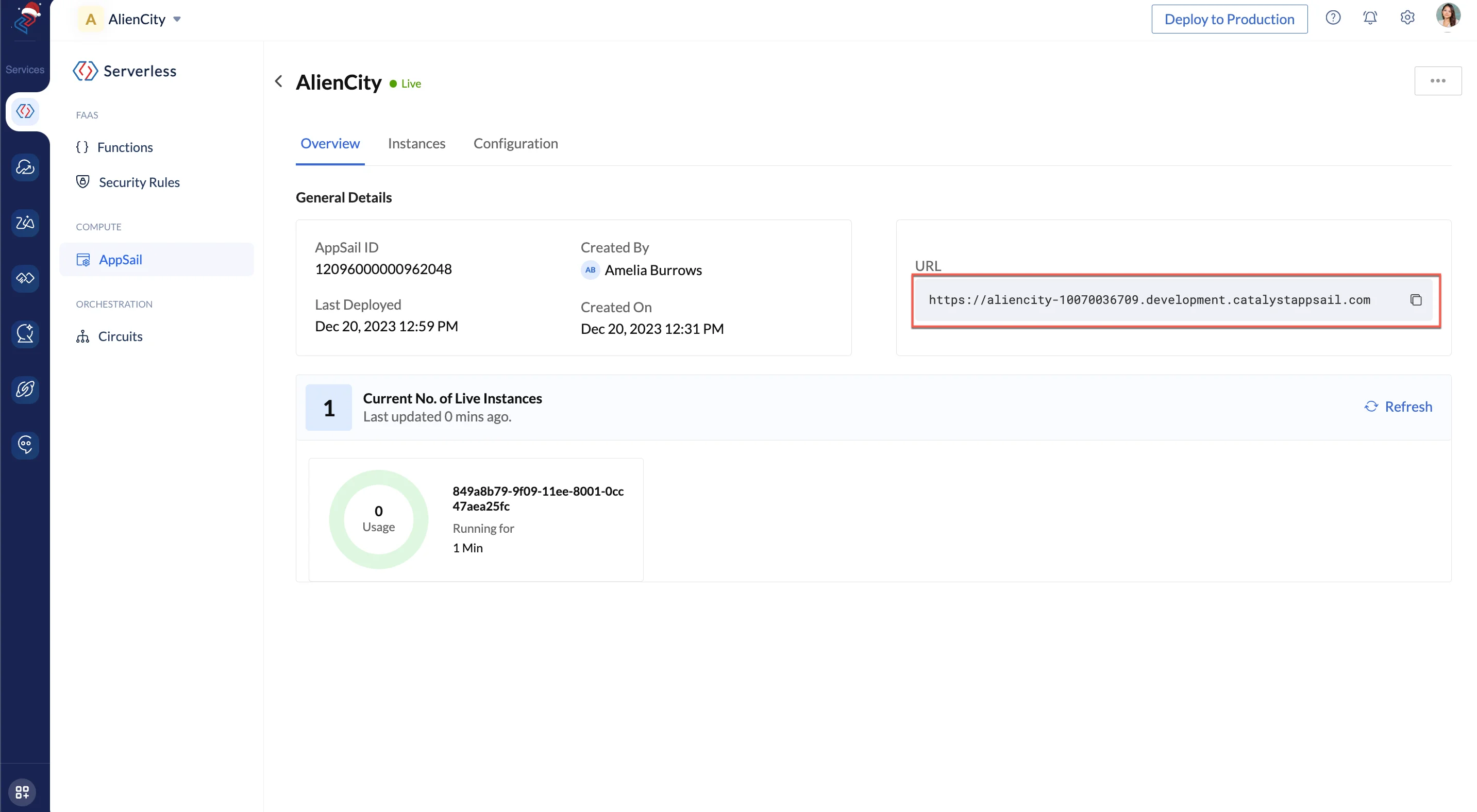 Click the Alien City service and you will be able to view the access URL generated by Catalyst. In this section you will also have access to a live dashboard denoting the number of instances the Alien City service has spawned at any given moment. Using this section you will also be able configure and manage the AppSail service. You can find out more about this here. catalyst_alien_city_cli_appsail_py_deploy_console_2