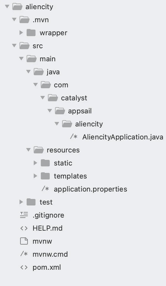 Unzip the downloaded file and this directory, aliencity/ will be our local directory where we initialize the Catalyst AppSail service for our project. Along with all the required dependencies, it will also contain the AliencityApplication.java file. This file will contain the logic that allows you to run the application on Spring Boot.