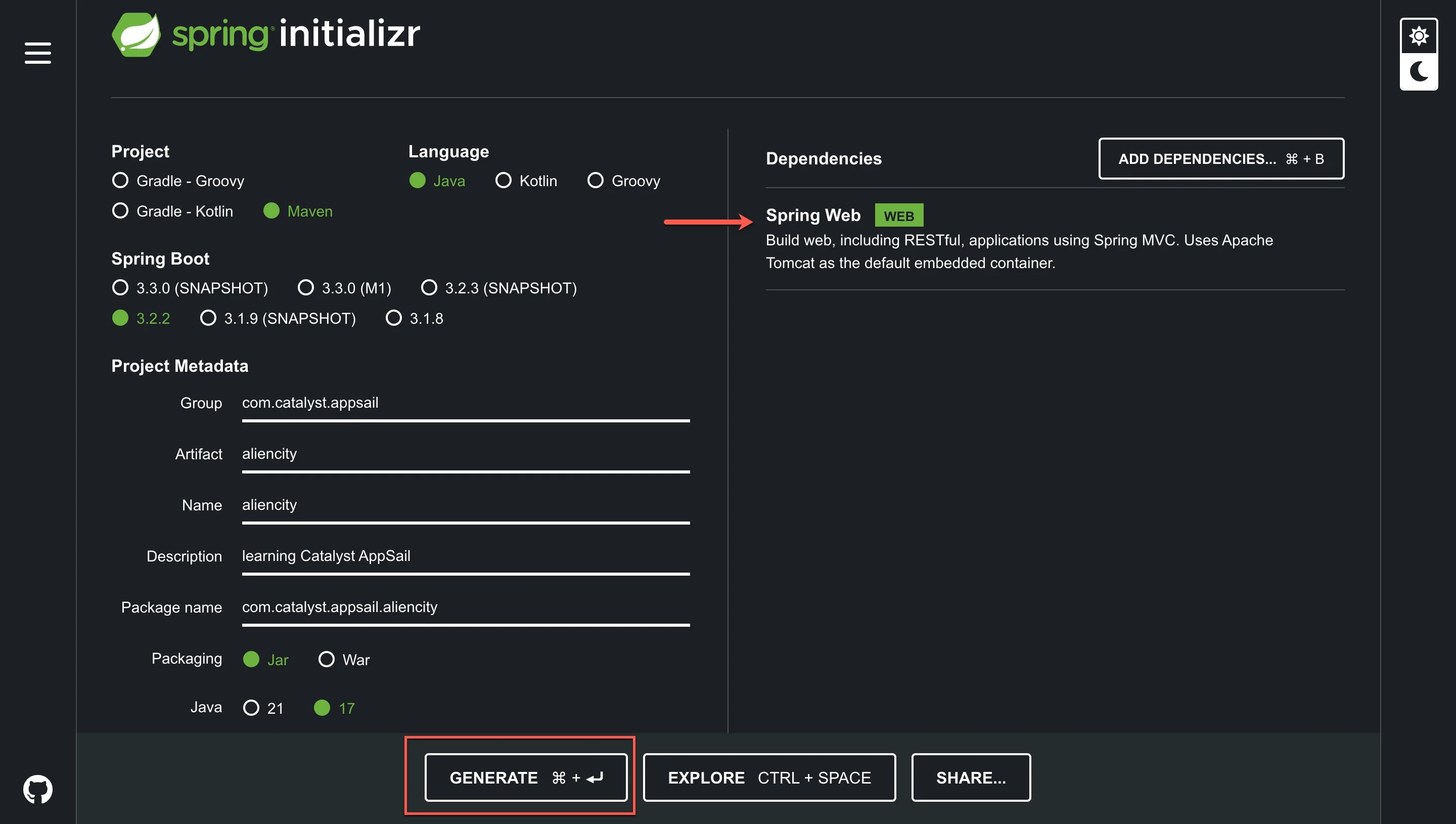 Search for Spring Web in the drop-down and select the dependency. This step will install all the necessary dependencies required to build a Spring Boot web application when you generate the package.
