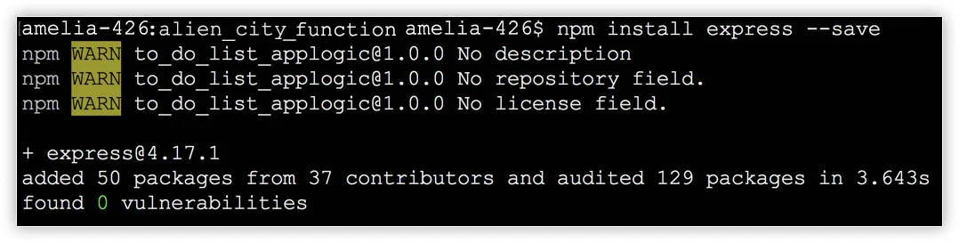 To install Express.js in your local machine, navigate to the Node function’s directory (functions/alien_city_function) in your terminal and execute the following command:
