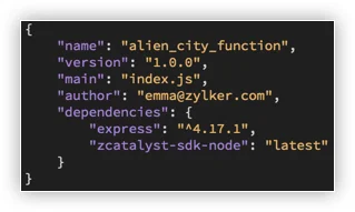The Node.js function directory ( functions/alien_city_function ) contains the following files: