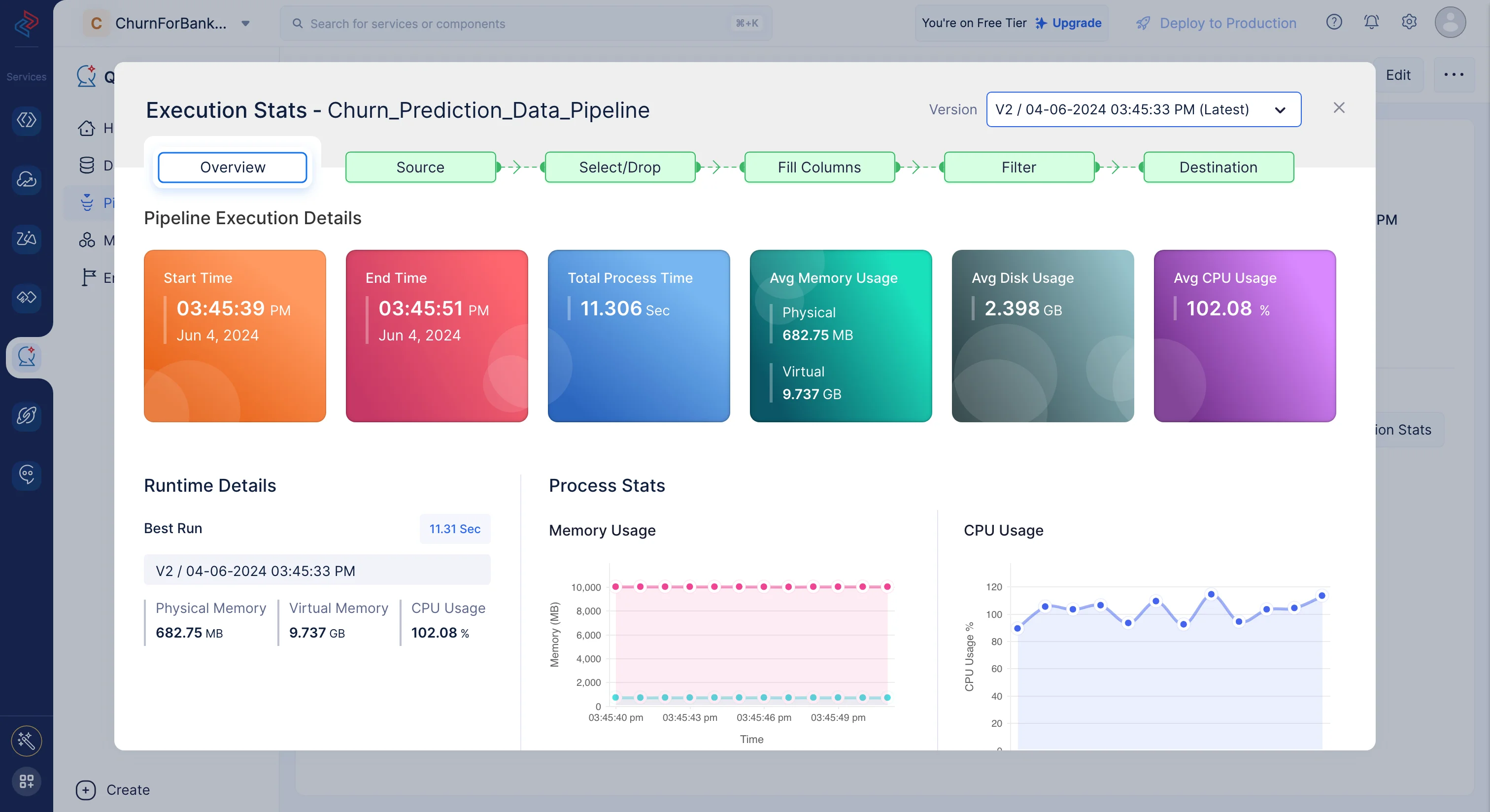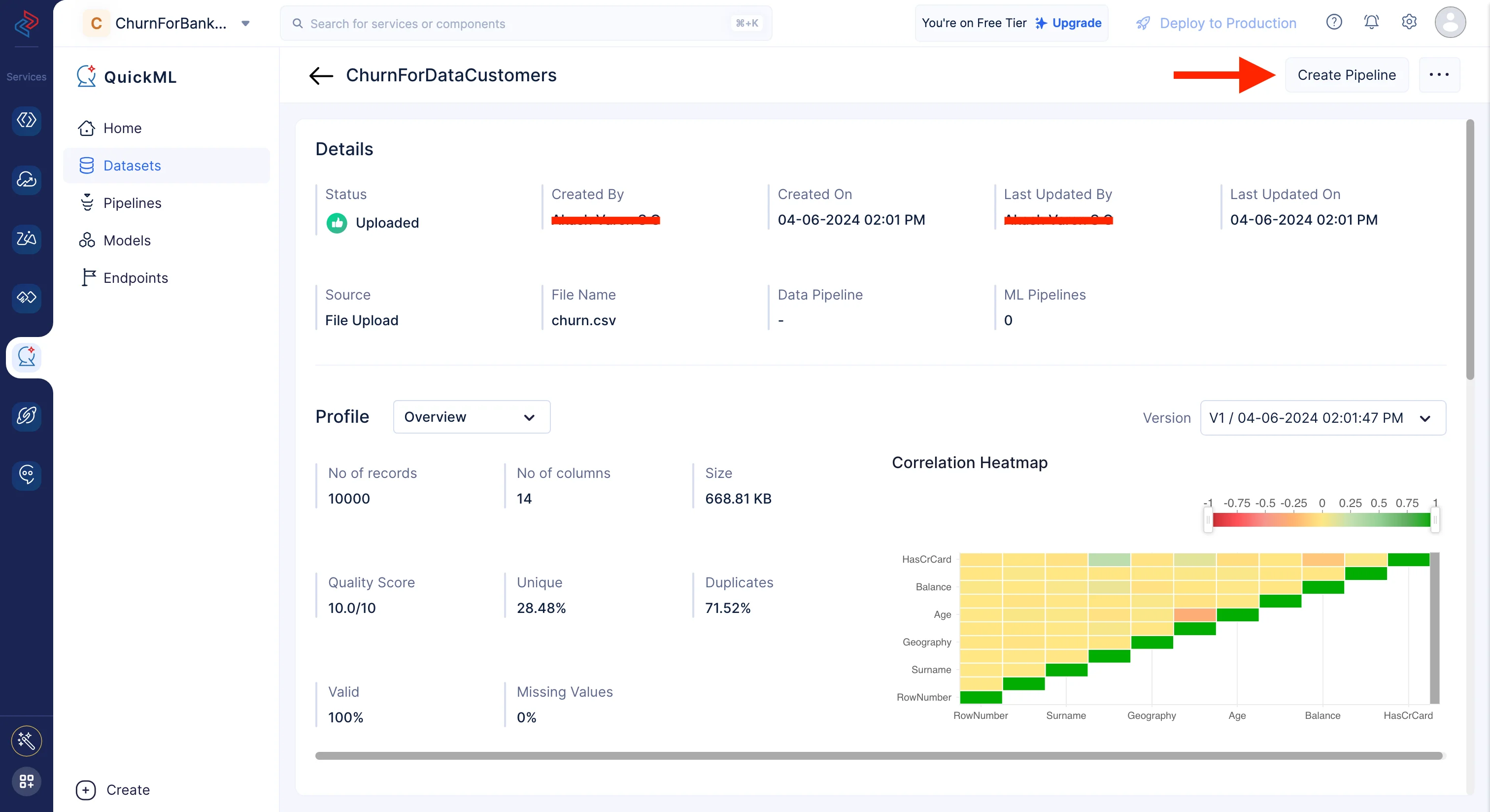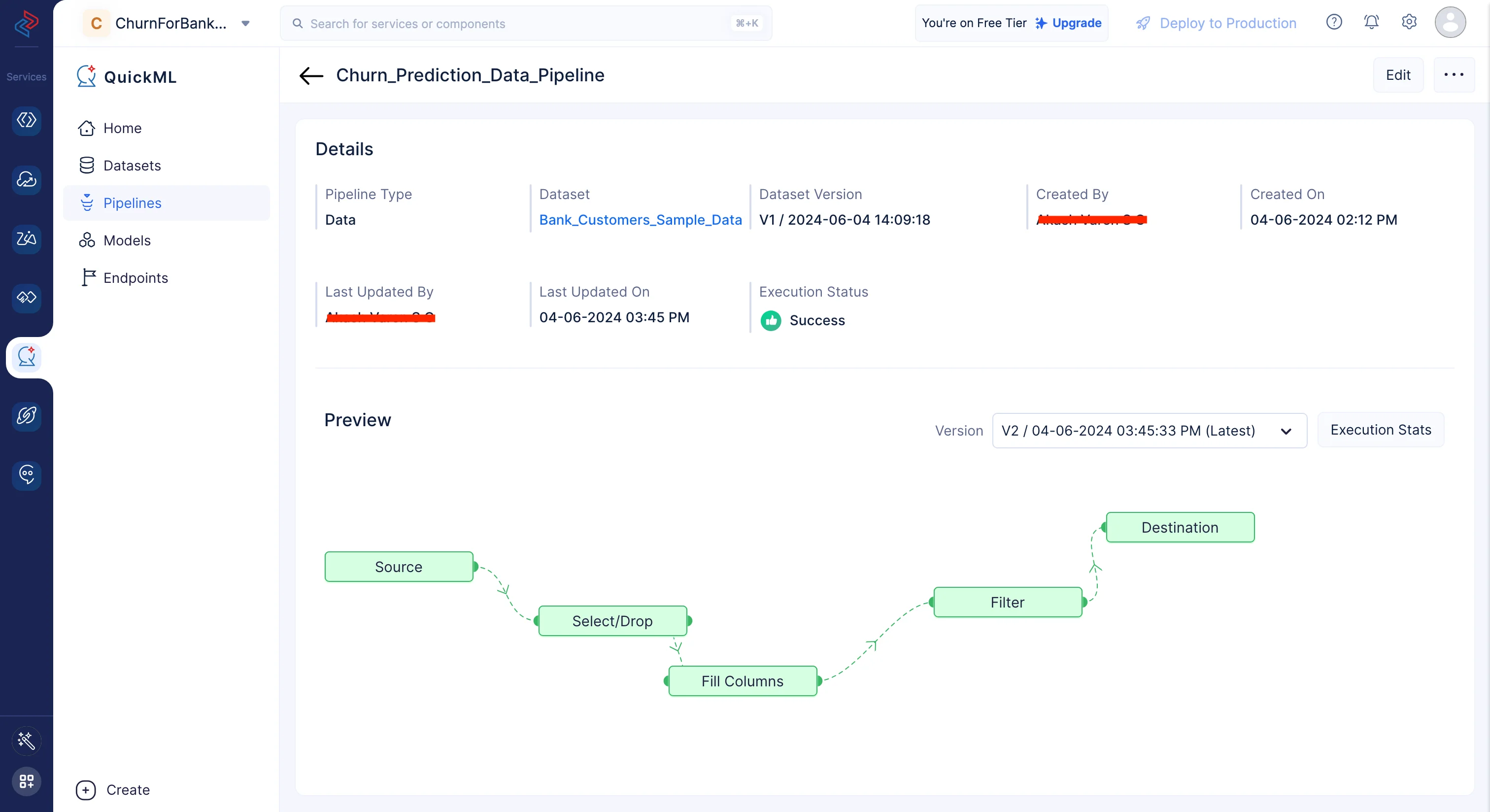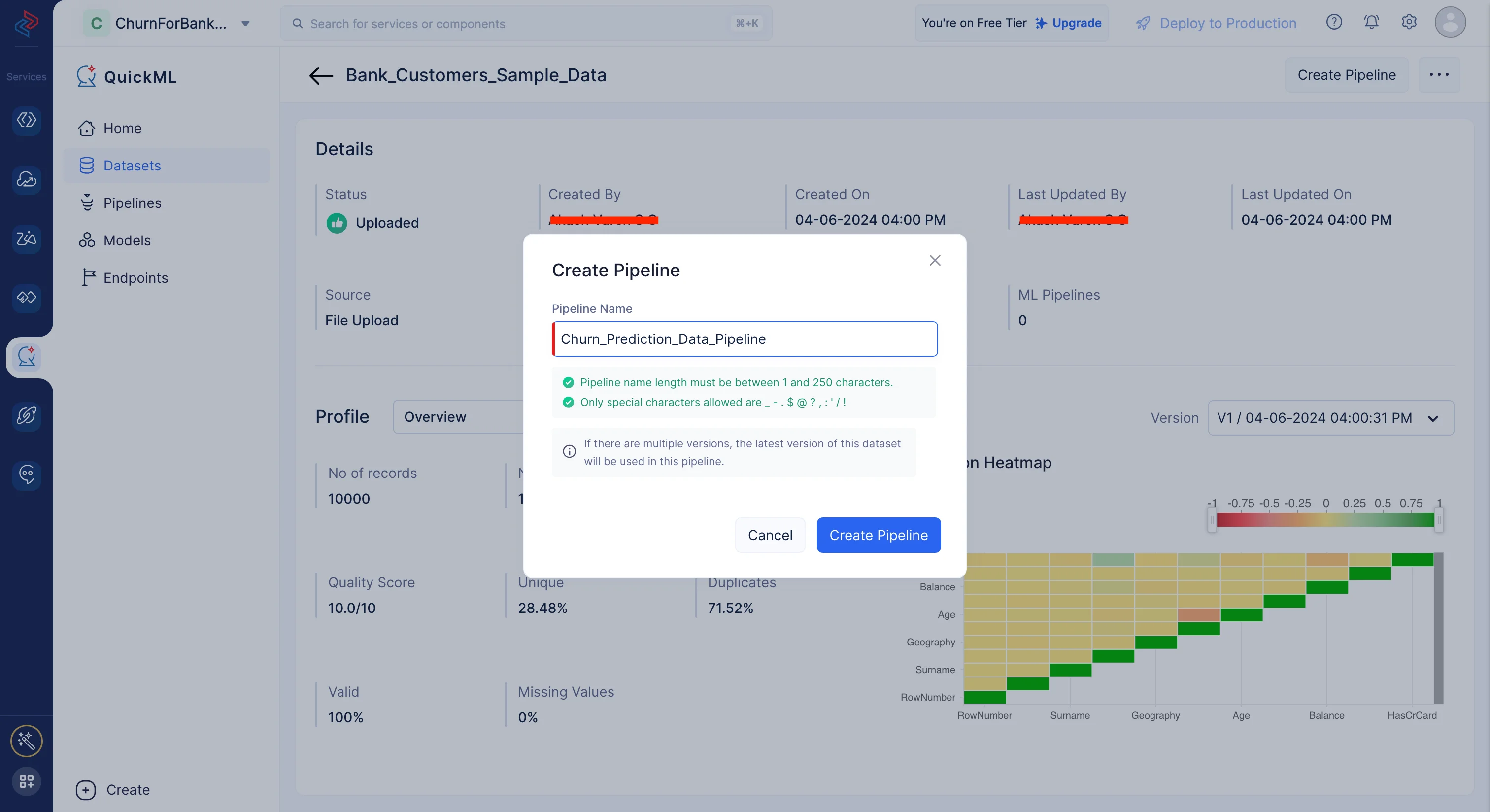 Name the pipeline “Churn_Prediction_Data_Pipeline” and click Create Pipeline.