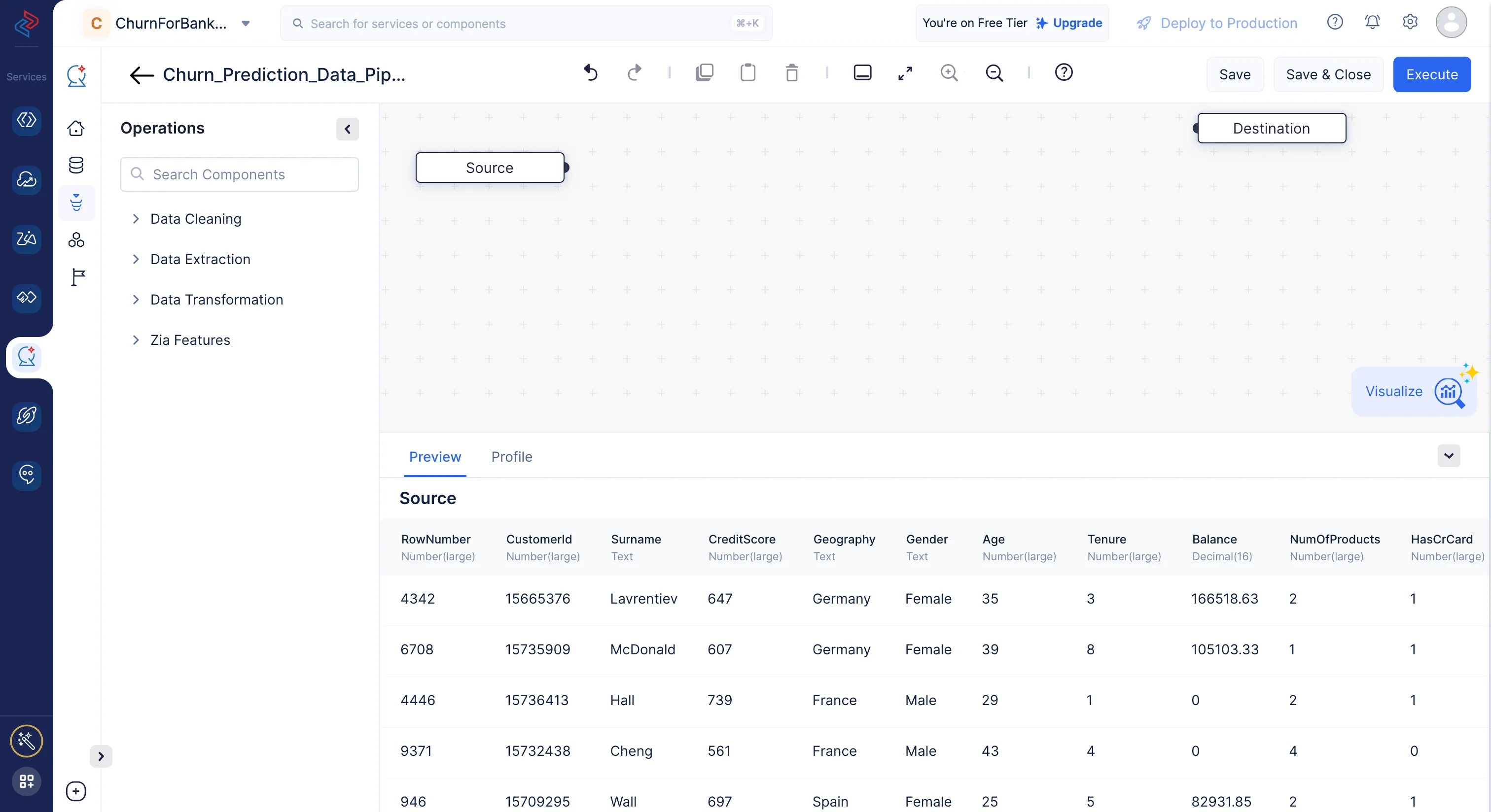 Selecting or dropping columns from a dataset is a common data preprocessing step in data analysis and machine learning. The choice to select or drop columns depends on the specific objectives and requirements of your analysis or modelling task. The columns we don’t need for our model training from this dataset are “RowNumber”, “CustomerId” and “Surname” in the provided datasets. Using QuickML, you may quickly choose the necessary fields from the dataset for model training using the Select/Drop node from the Data Cleaning component.