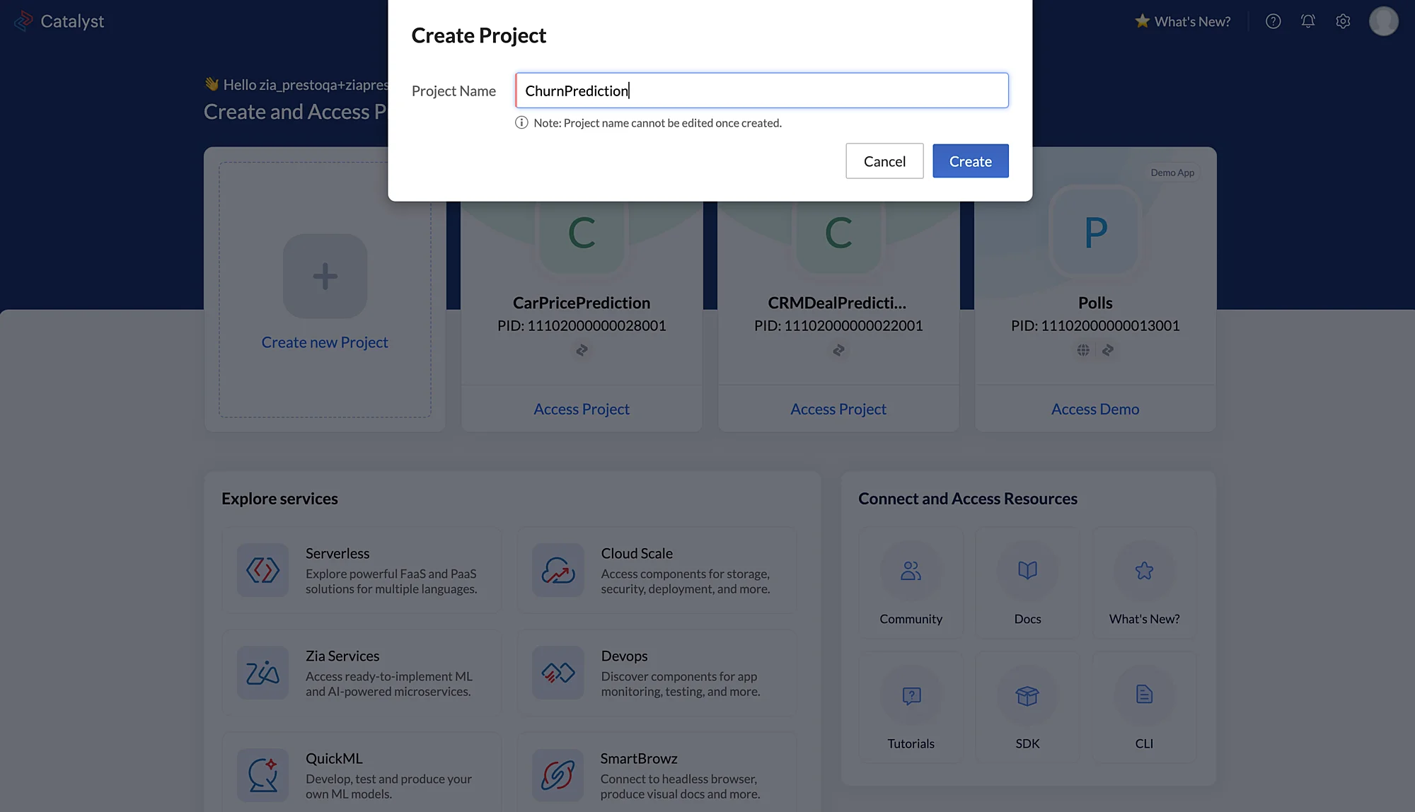 Enter the project’s name as “ChurnPrediction” (or a name you wish to give for the project) in the pop-up window that appears.