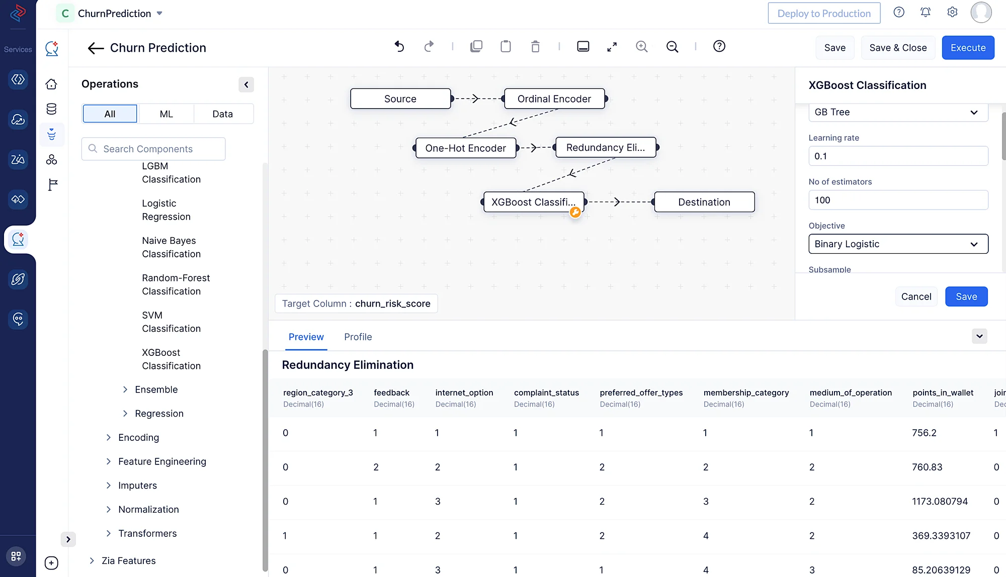 Here we are using ordinal encoding to encode the following categorical features: “membership_category”, preferred_offer_types", “medium_of_operation”, “internet_option”, “gender”, “used_special_discount”, “past_complaints”, “complaint_status” and “feedback”. It assigns integers to the categories based on their order, making it possible for machine learning algorithms to capture the ordinal nature of the data. We’ll use the Ordinal Encoder node by navigating to ML operations, clicking the ->Encoding component, and choosing-> Ordinal Encoder in QuickML to turn the selected category columns into numerical columns.