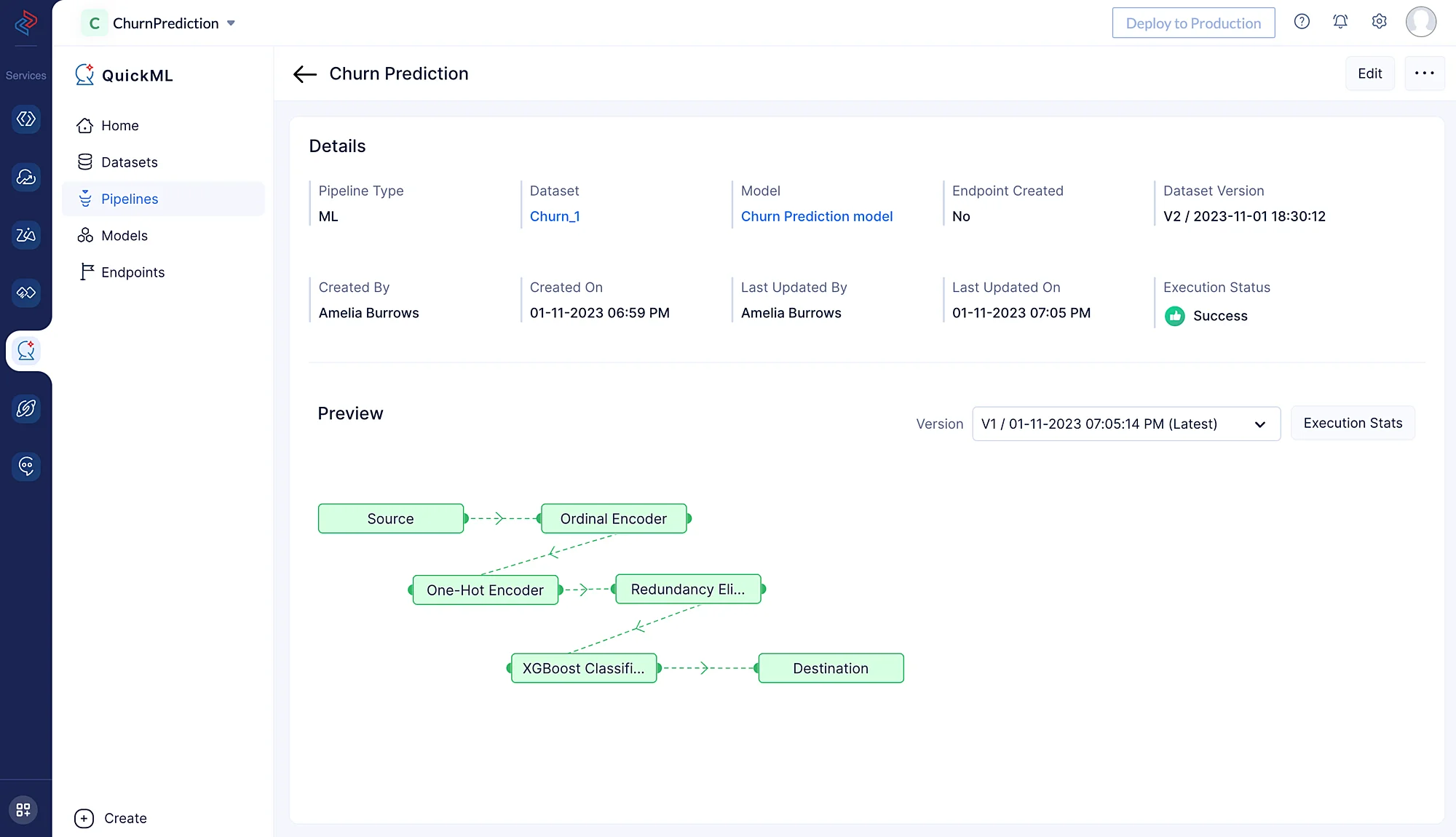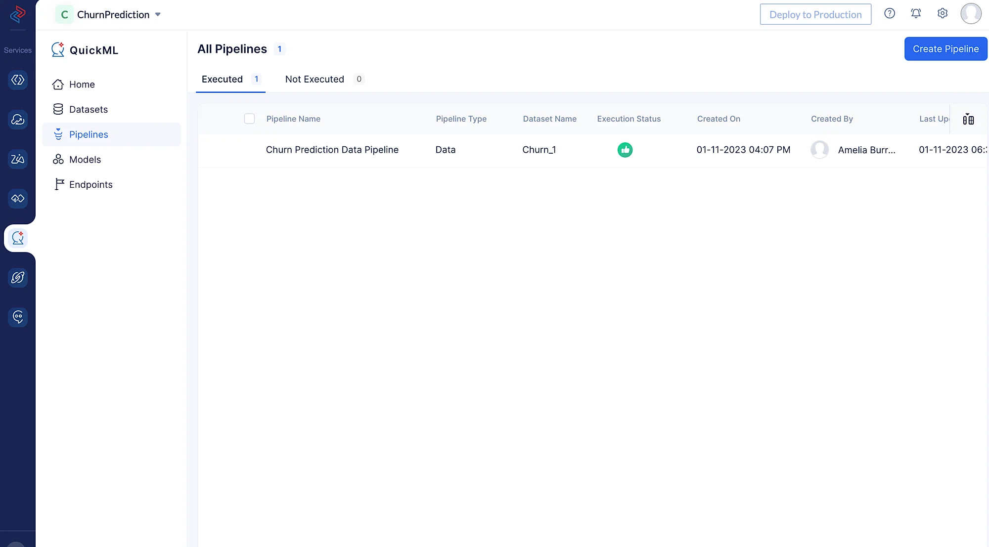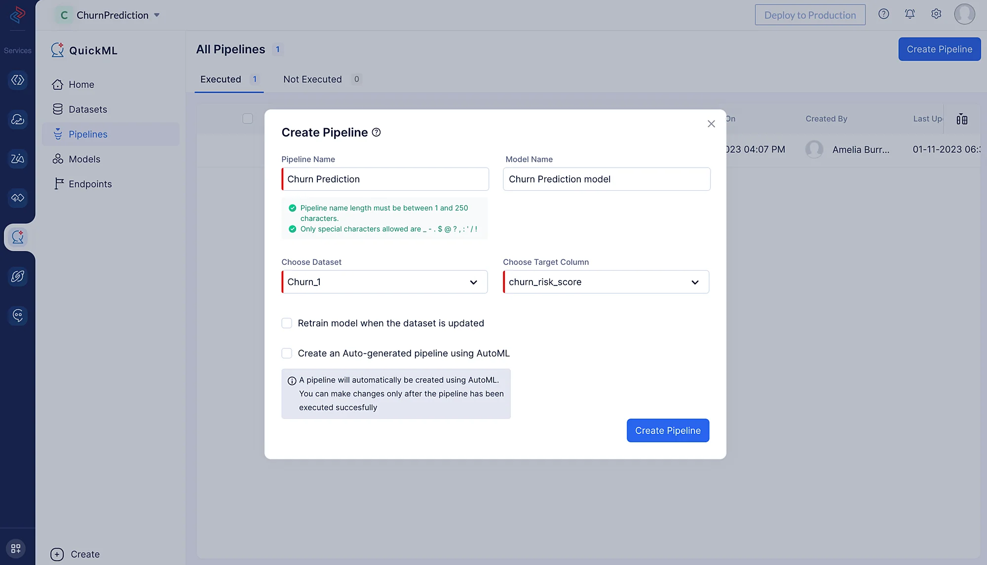 In the pop-up that appears, provide the pipeline name, we’ll Name the pipeline as Churn Prediction and the model Churn Prediction Model in the Create Pipeline pop-up. Then, select the appropriate dataset and the column name of the target.