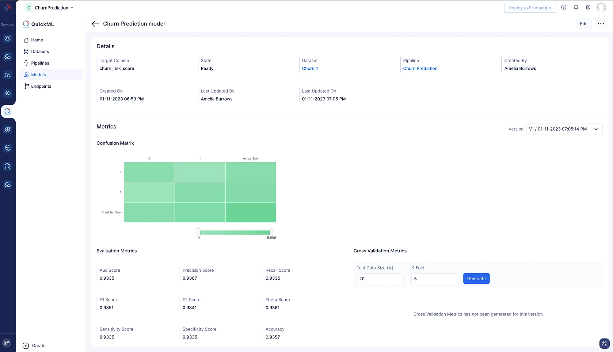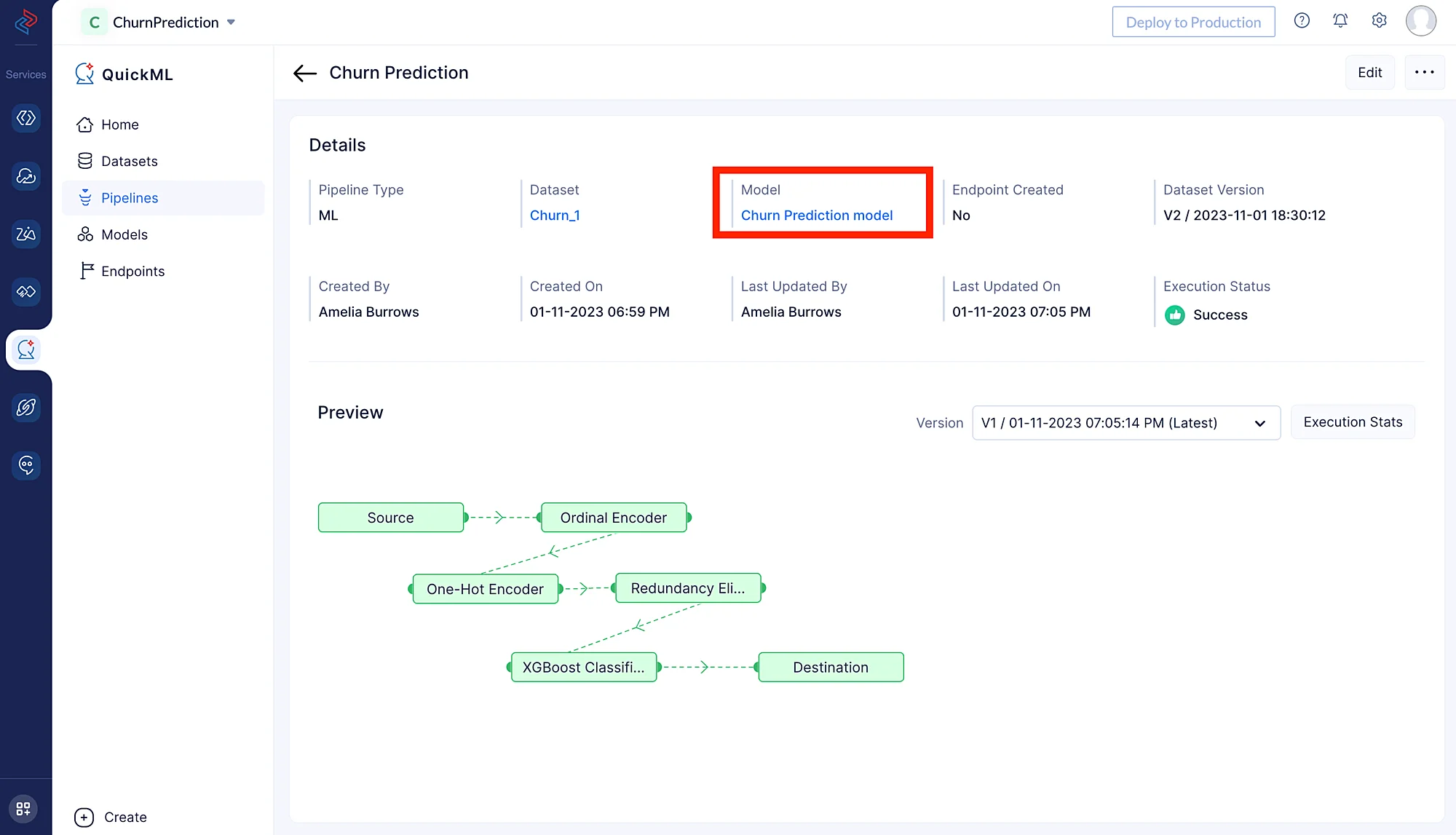 The prediction model is created and can be examined under the Model section(click on Churn Prediction model) following the successful completion of the ML workflow.