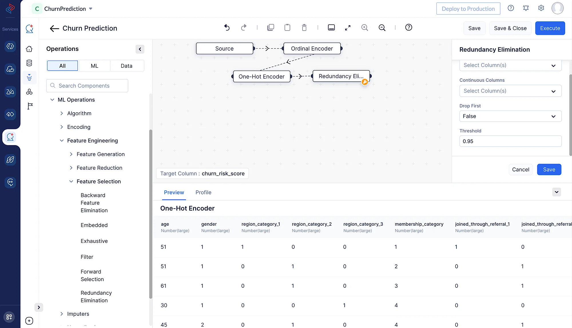 Here, we are using One-Hot Encoder node to encode the following columns: “region_category”, “joined_through_referral” and “offer_application_preference”. We’ll use the One-Hot Encoder node by navigating to ML operations, selecting the -> Encoding component and choosing -> One-Hot Encoder in QuickML to turn the selected category columns into numerical columns.
